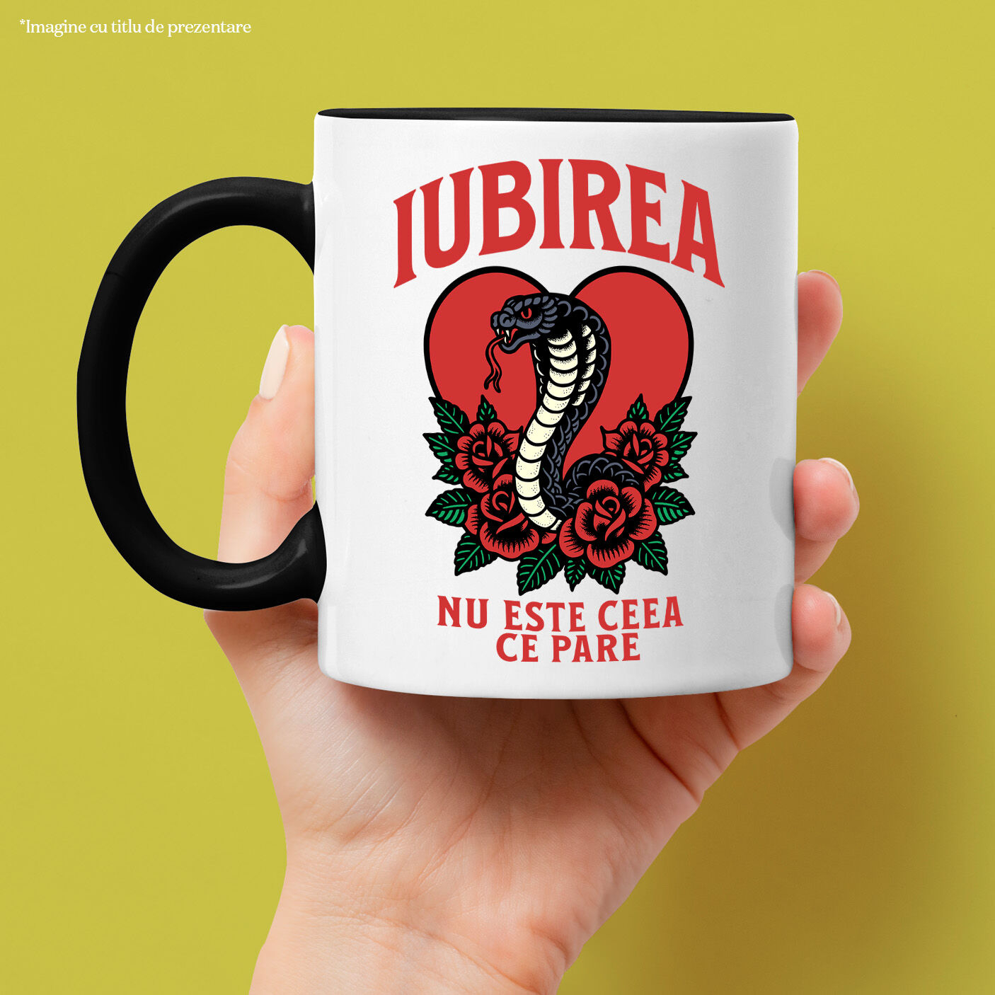 Cana Personalizata cu Sarpe Printre Flori Rosi, Inima Franta, Iubire falsa, Animal Otravitor, Ceramica, 330ML, cu Maner Negru