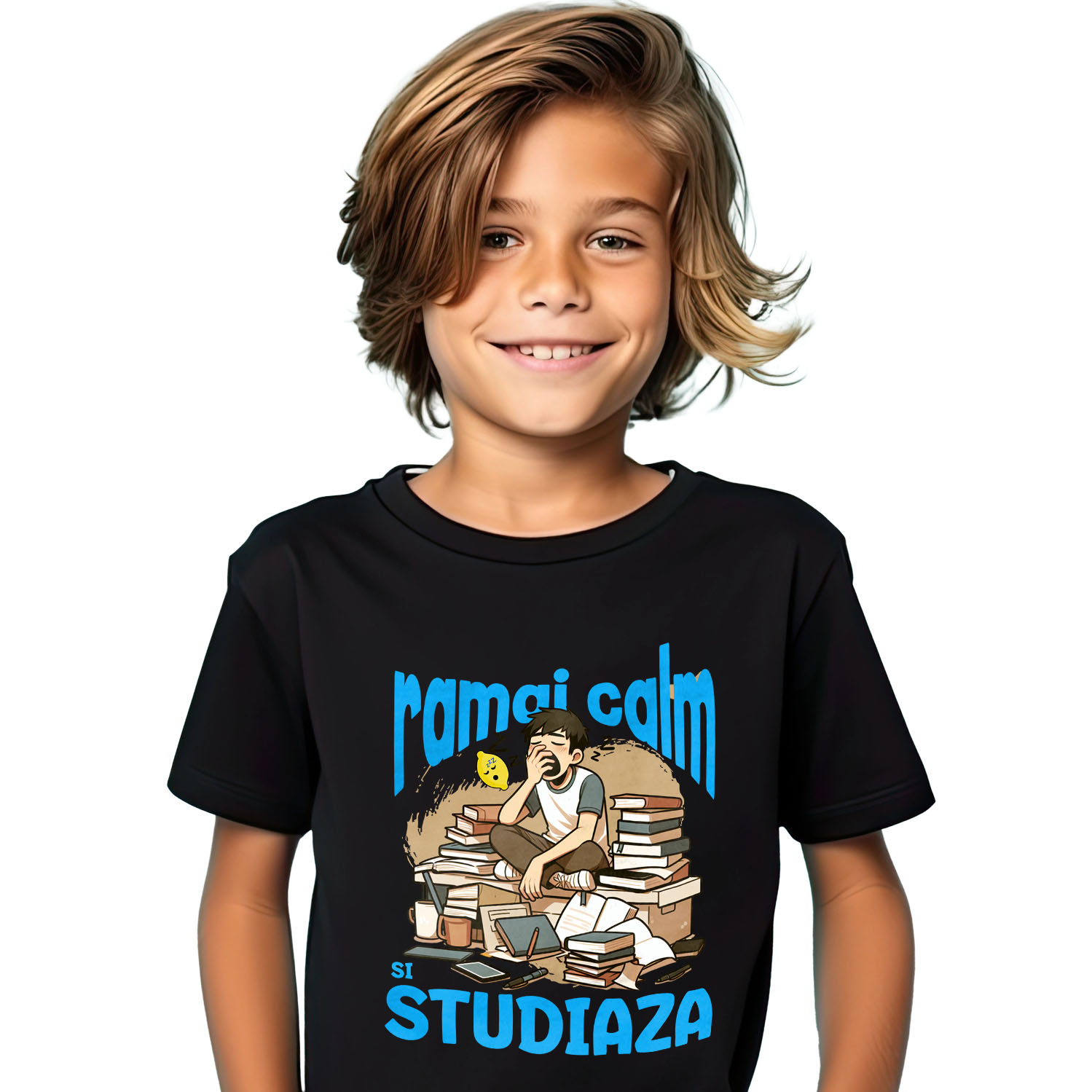 Tricou Copii cu Baiat Extenuat Cascand Somn Teanc De Carti studiaza Facultate cu imprimeu pe Fata, 100% Bumbac, Negru, 10 Ani