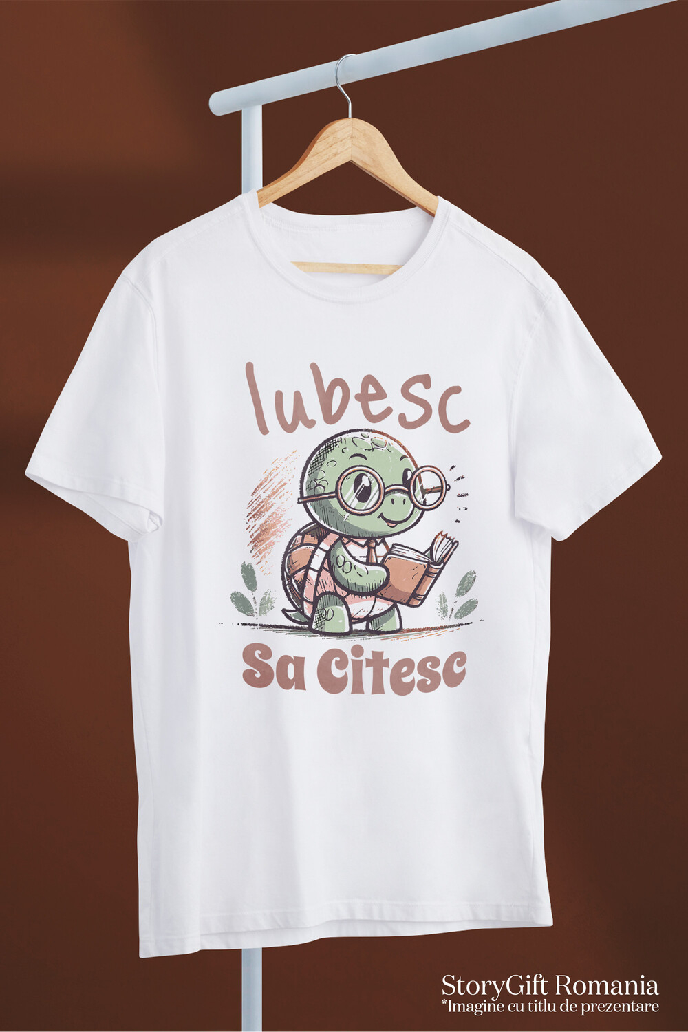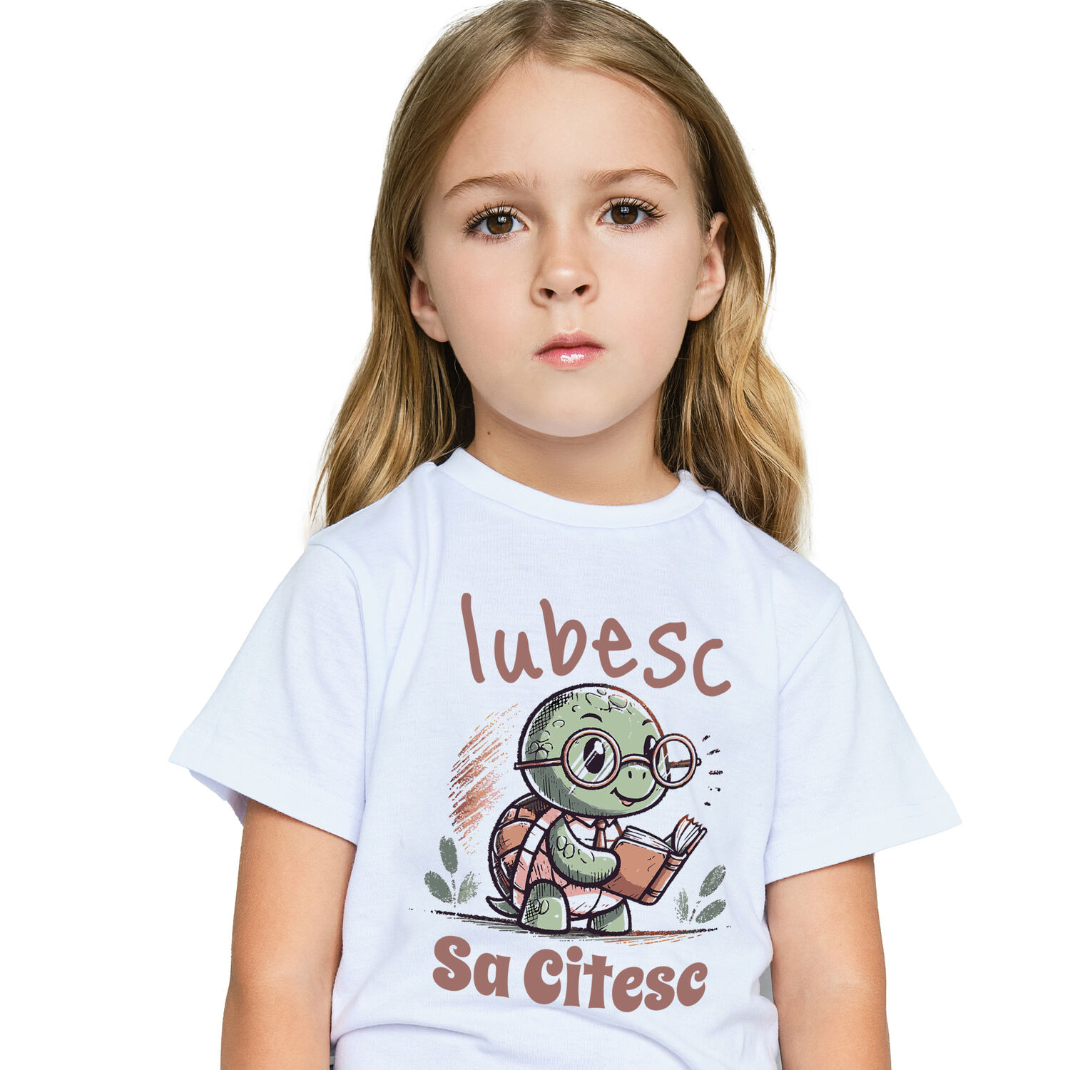 Tricou Copii cu Broasca testoasa Cu carte Inteligenta Si Ochelari de soare Dragoste Geniu cu imprimeu pe Fata, 100% Bumbac, Alb, 12 Ani