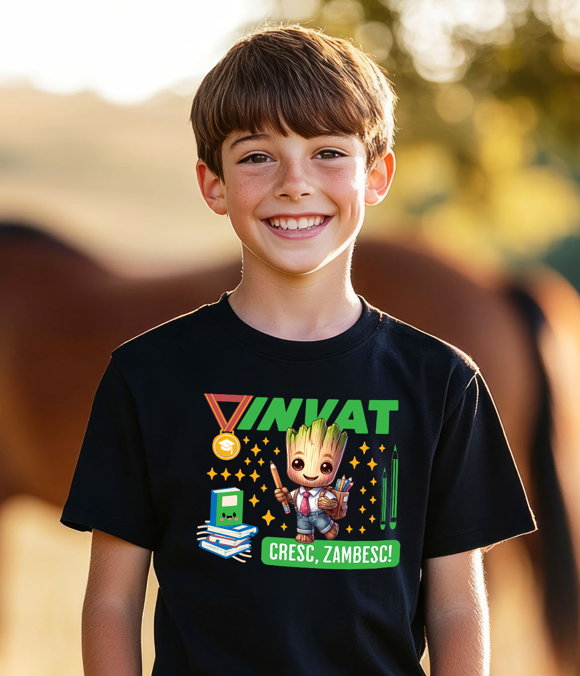 Tricou Copii cu Groot Invatam, Zambim, Ne Dezvoltam 100% Bumbac, Negru, 6 Ani