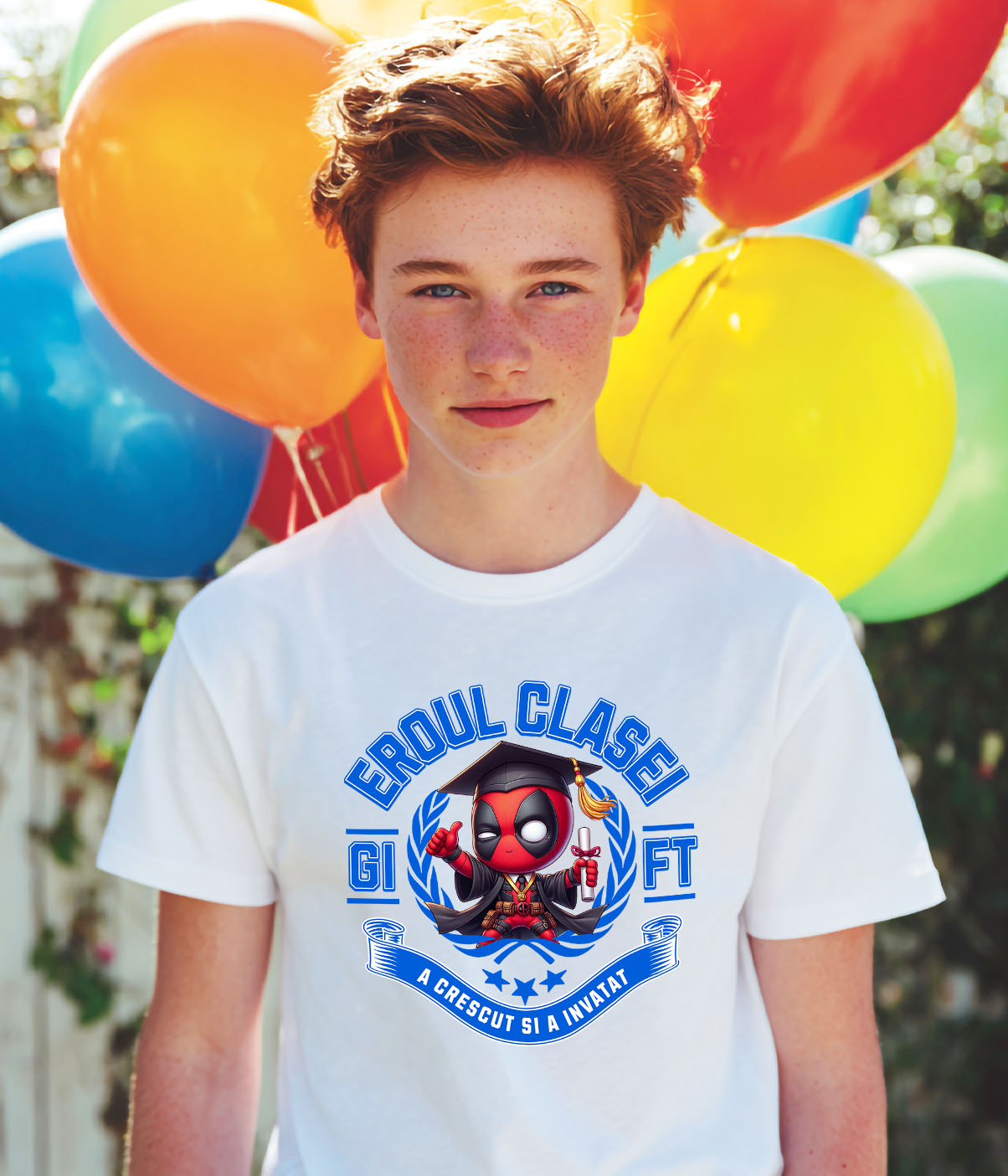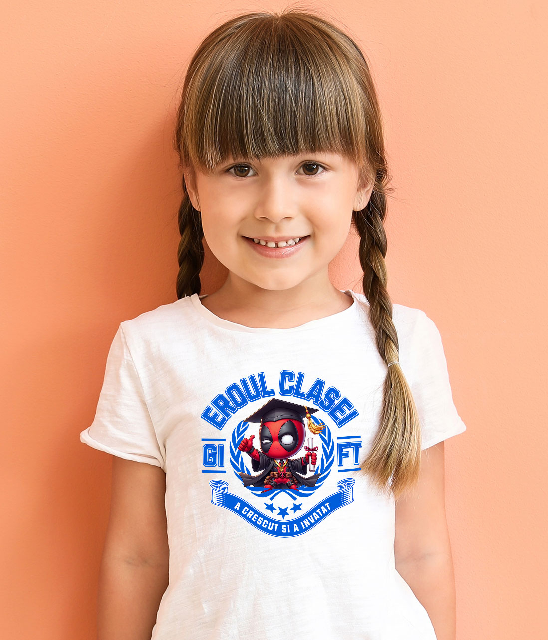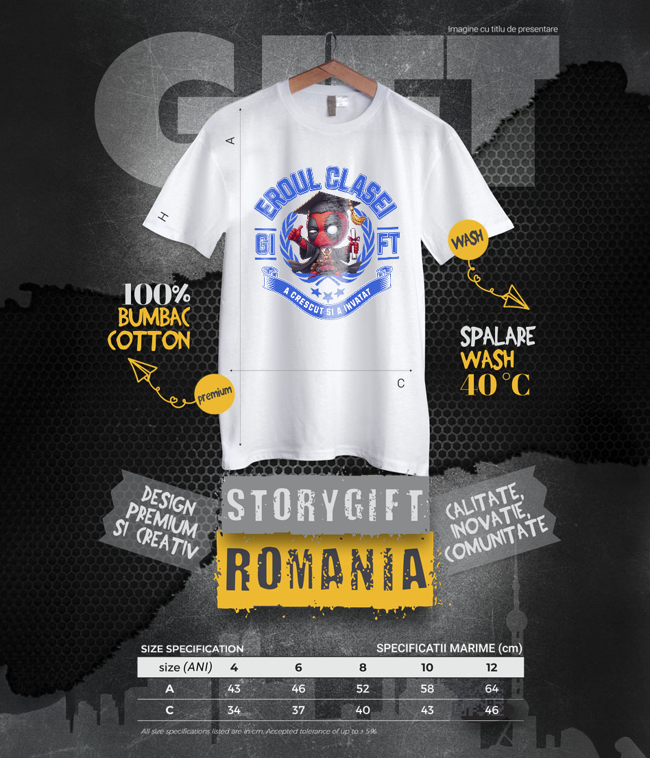 Tricou Copii cu Deadpool – Curaj, Joaca, Cunoastere 100% Bumbac, Alb, 10 Ani