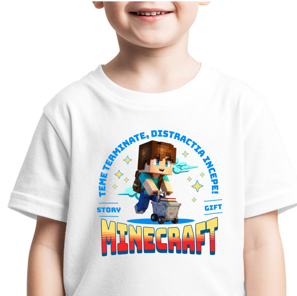 Tricou Copii cu Minecraft: Skateboard Si Distractie Cu Prietenii 100% Bumbac, Alb, 8 Ani