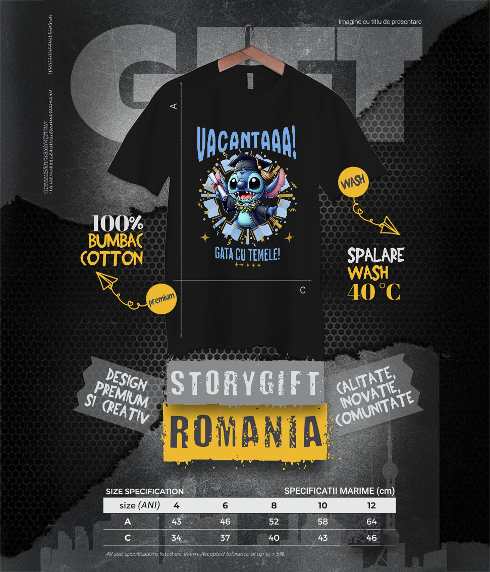 Tricou Copii cu Explorari de Vacanta cu Stitch si Diplome 100% Bumbac, Negru, 8 Ani