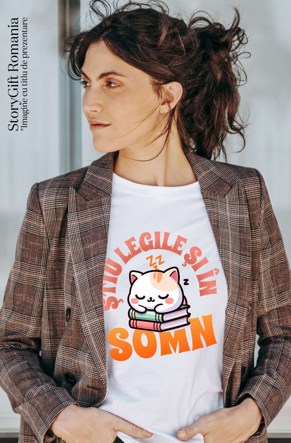Tricou Femei cu pisica somnoroasa dormind Pe Teanc De Carti Juridic Facurtate Drept cu imprimeu pe Fata, 100% Bumbac, Alb, S