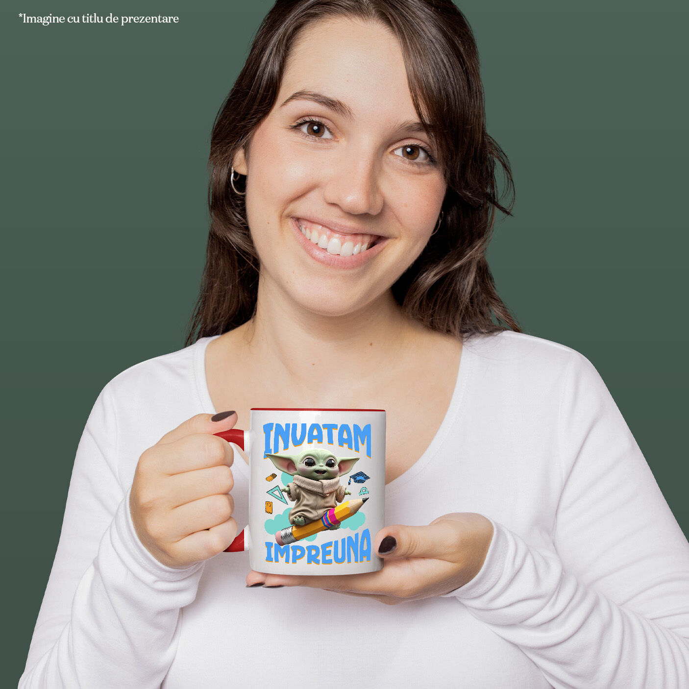 Cana Cu Baby Yoda – Joaca, Zambet si Prietenie Ceramica, 330ML, cu Maner Rosu