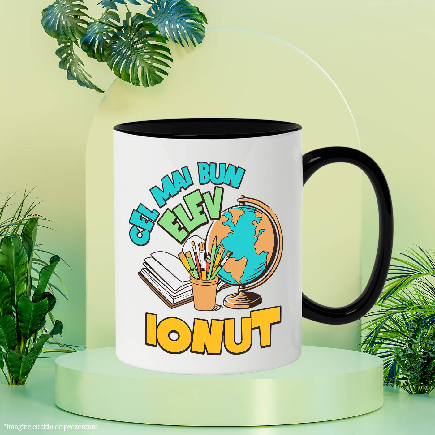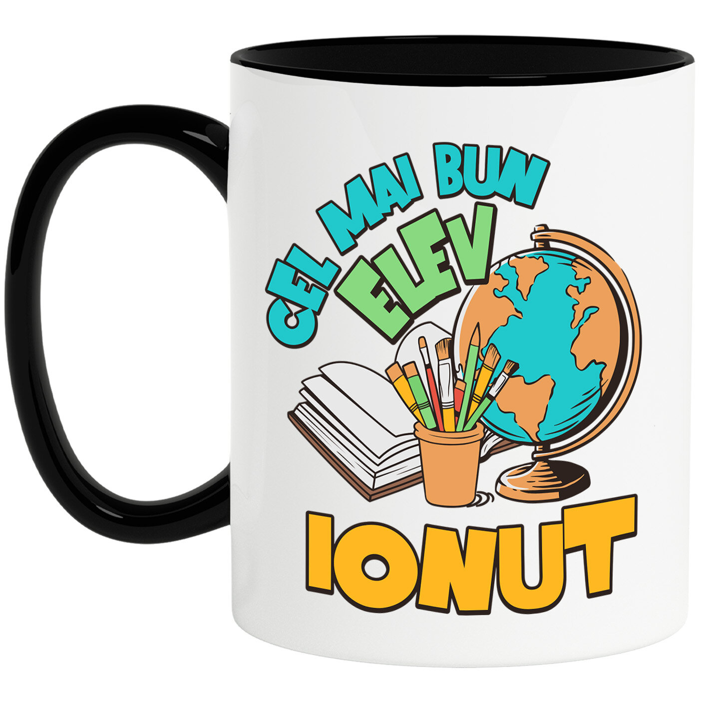 Cana Personalizata cu Rechizite Scolara Glob Pamantesc Carioci Pensule Carte Deschise Text Elev , Ceramica, 330ML, cu Maner Negru