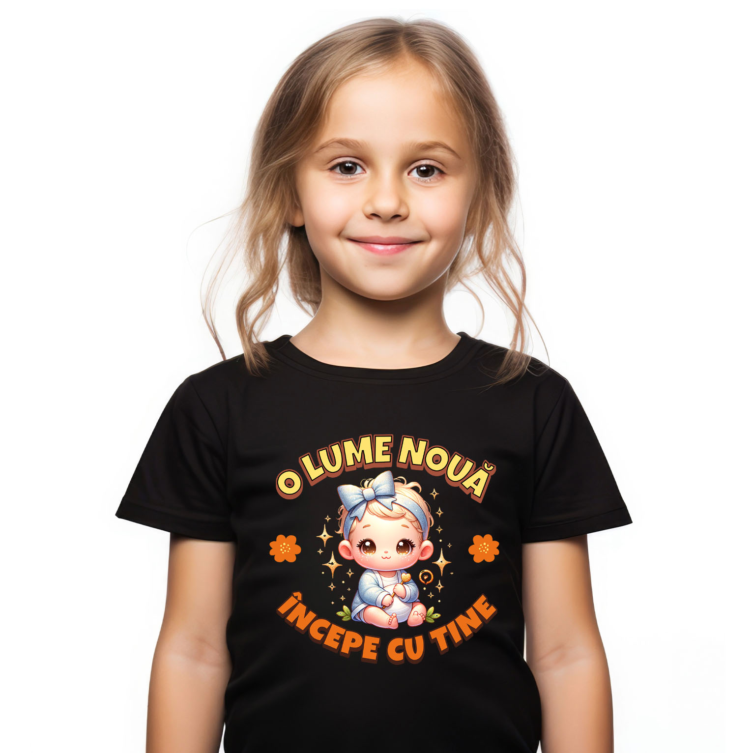Tricou Copii cu Copil Bebe Fata Cu Funda, Familie Nou-Nascut, Fericire cu imprimeu pe Fata, 100% Bumbac, Negru, 8 Ani