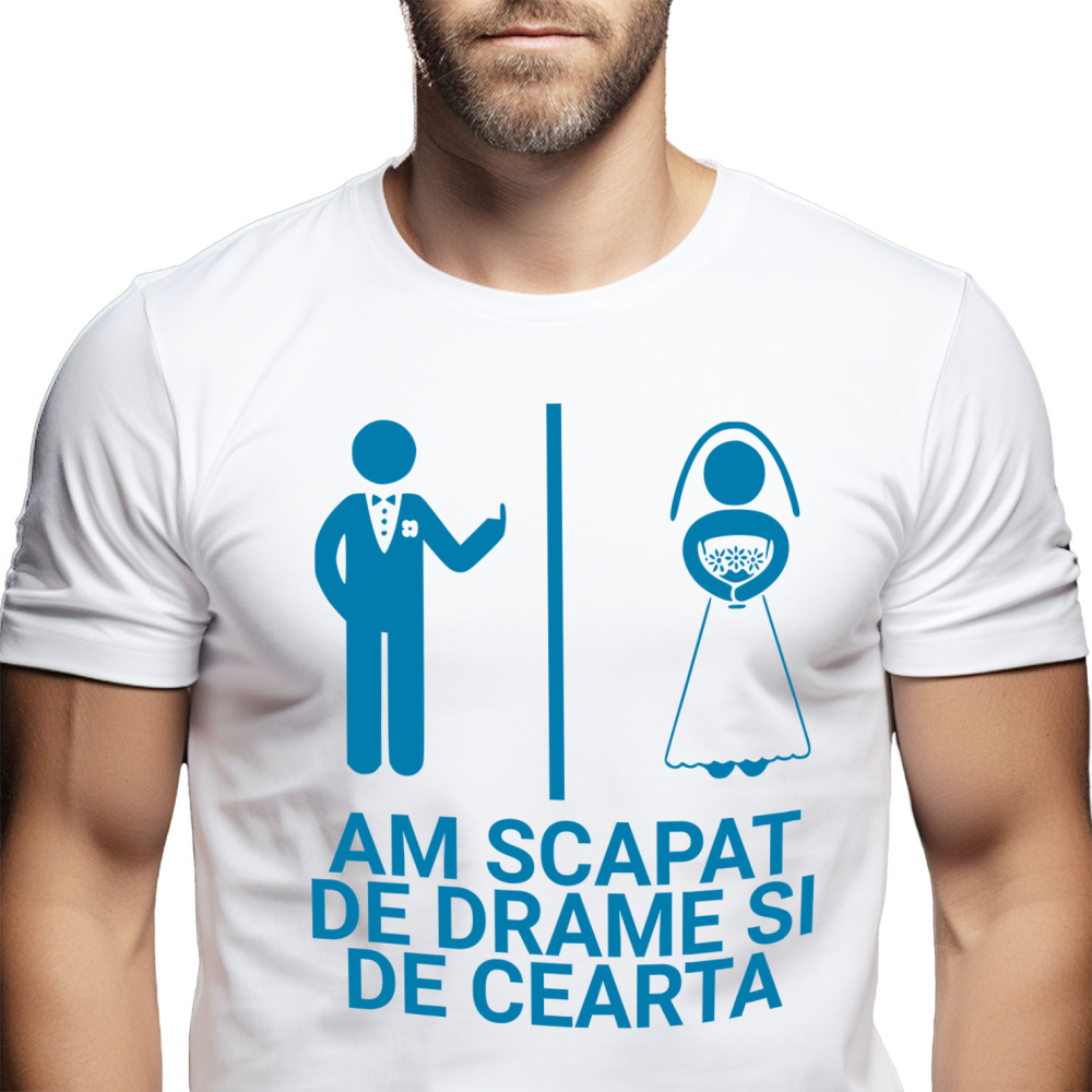 Tricou Barbati cu Design Haios Ziua Nuntii Cuplu Despartit De Perete Semn Obscen cu imprimeu pe Fata, 100% Bumbac, Alb, M