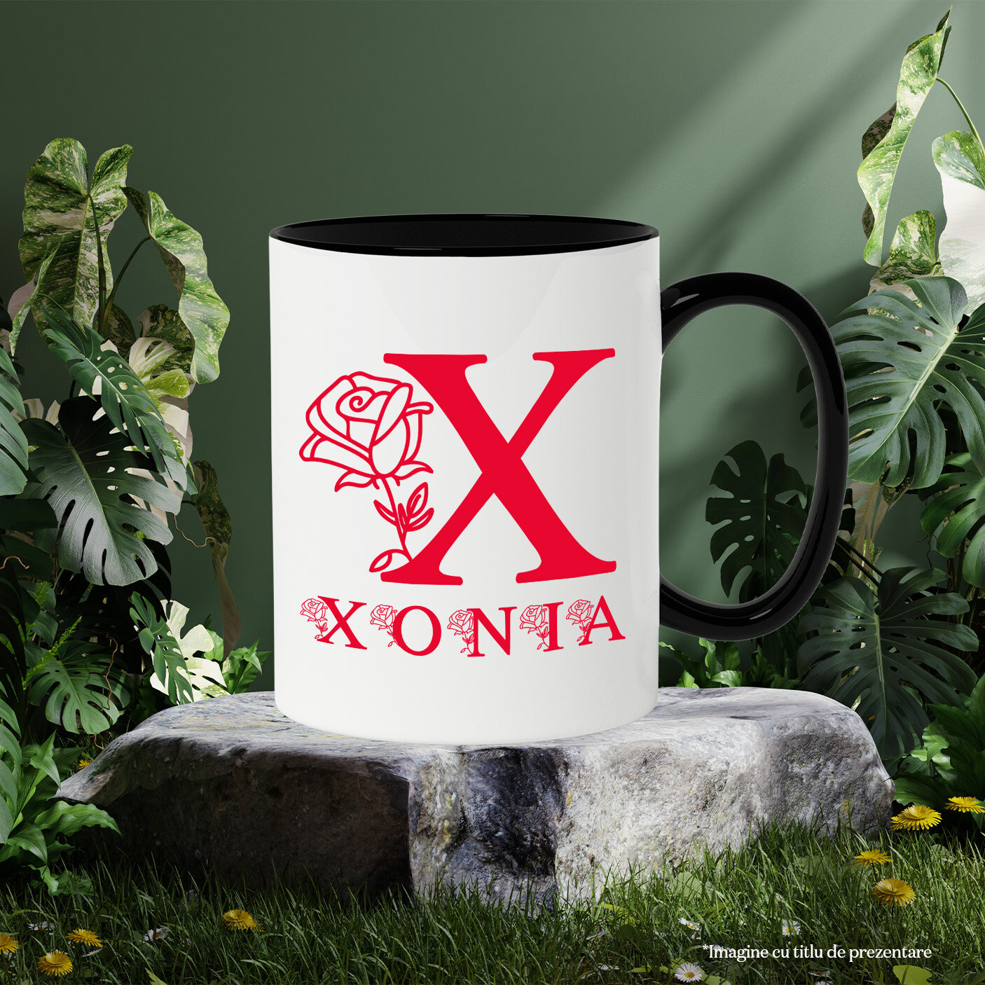 Cana Iubitorii De Trandafiri, Flori, Text Nume Personalizat, Valentine's Day, Culoare Rosu, Cu Litera, 330ML, Ceramica, Cu Maner si Interior Negru