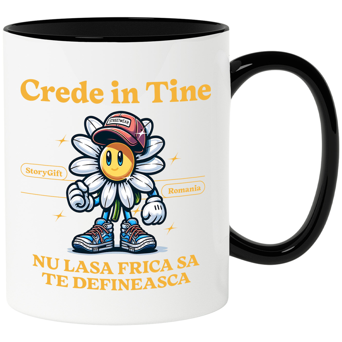 Cana Personalizata cu Floare Vesela Margareta Cu Sapca Si adidasi trendy, Copii, Inspirational, Ceramica, 330ML, cu Maner Negru