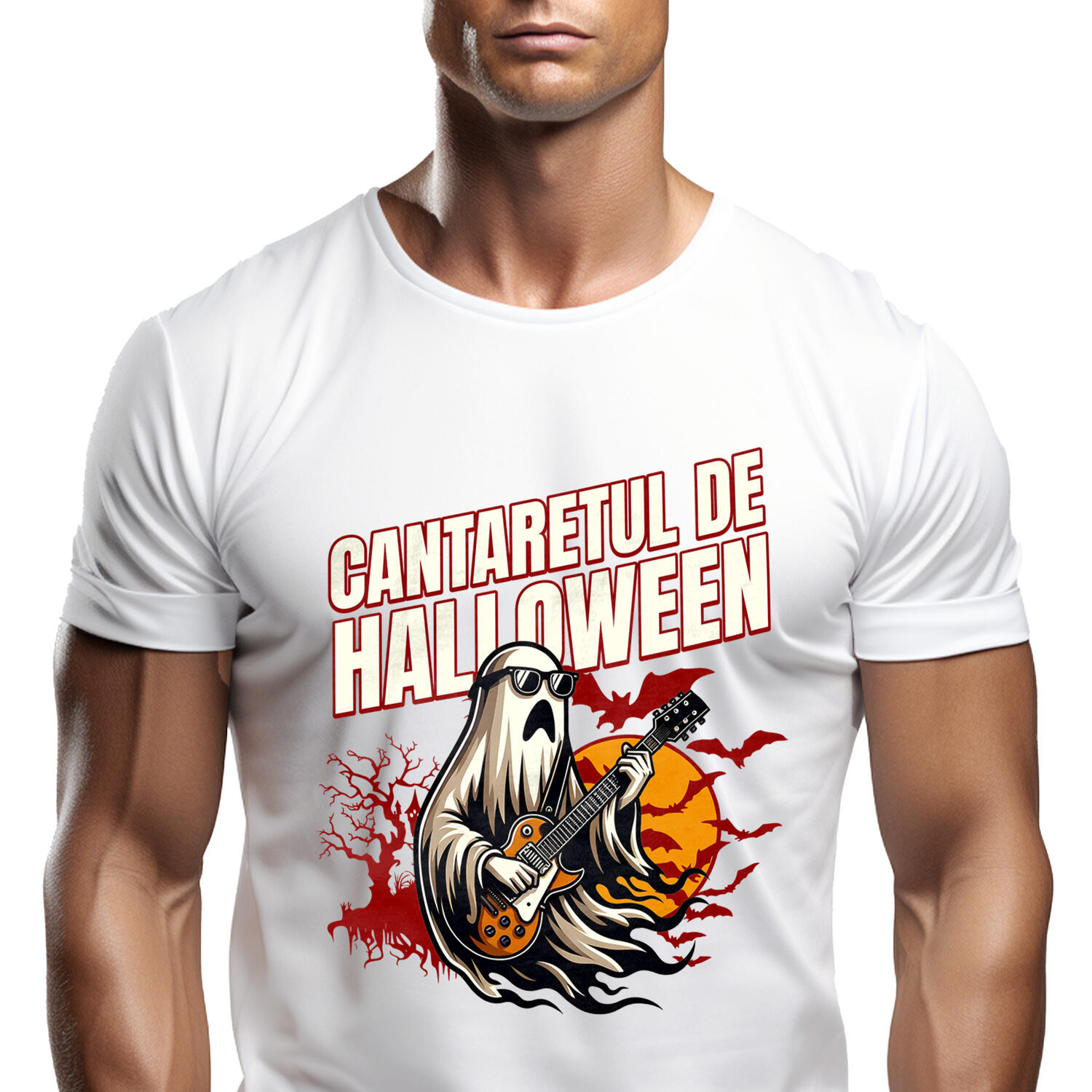 Tricou Barbati cu Mumie Cu Chitara Si Ochelari De Soare, Hallowen, Distractie Petrecere cu imprimeu pe Fata, 100% Bumbac, Alb, XL