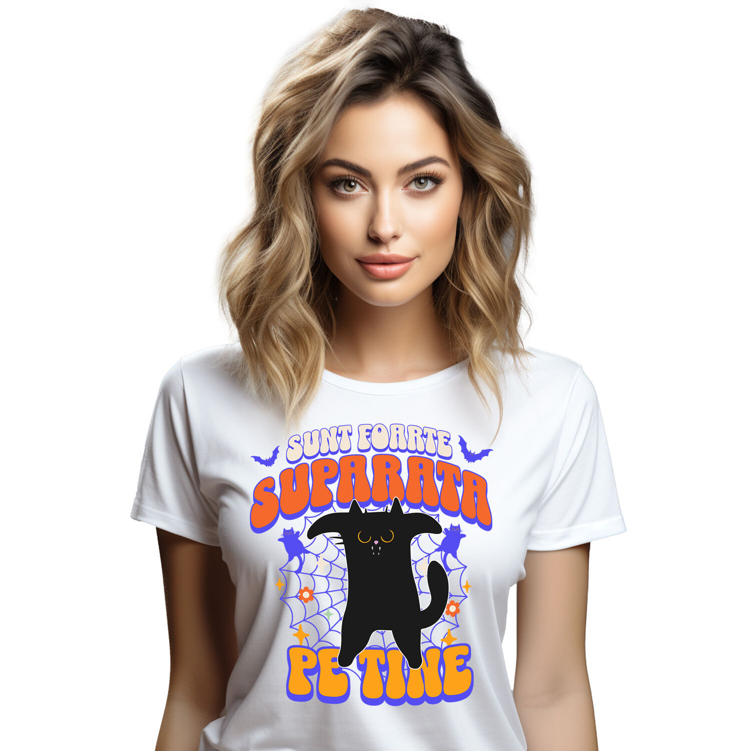 Tricou Femei cu Pisica Horror, Monstru Masiv, Animal Blanos, Hallowen, Copii cu imprimeu pe Fata, 100% Bumbac, Alb, S