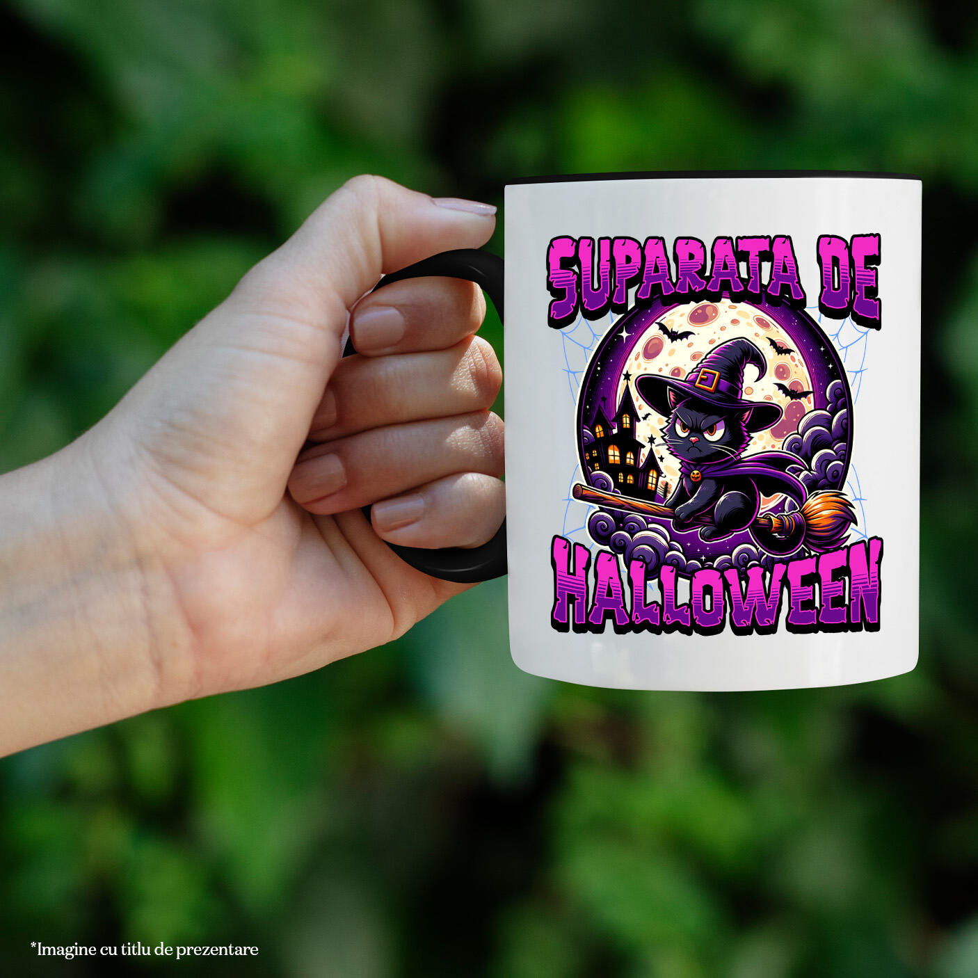 Cana Personalizata cu Pisica Neagra Pe Matura Cu Palarie De Vrajitoare, Hallowen, Sarbatoare Infricosatoare, Ceramica, 330ML, cu Maner Negru