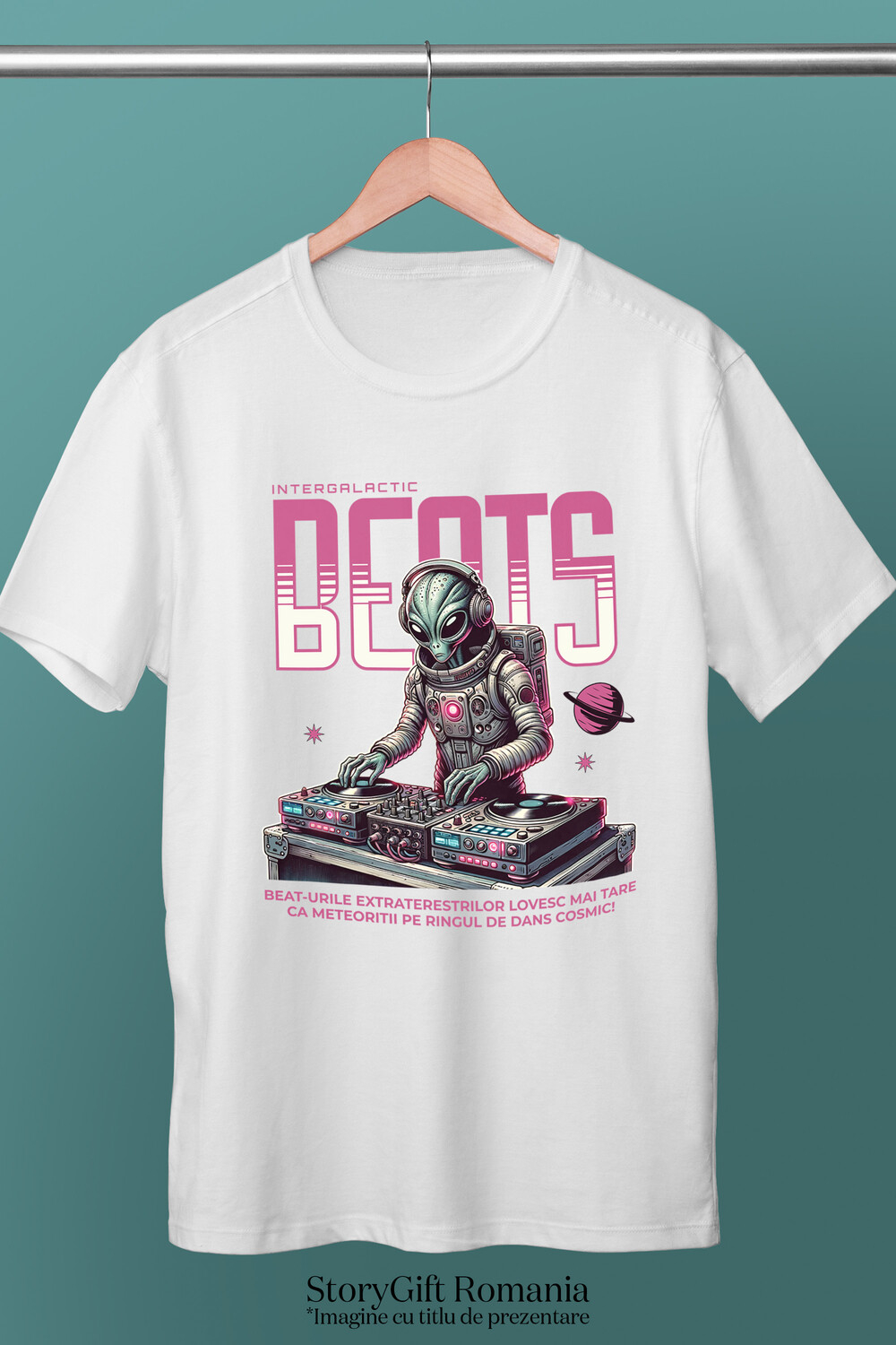 Tricou Barbati cu Extraterestru In Costum Spatial DJ Hobby Meserie Muzica Distractie Petrecere cu imprimeu pe Fata, 100% Bumbac, Alb, XL