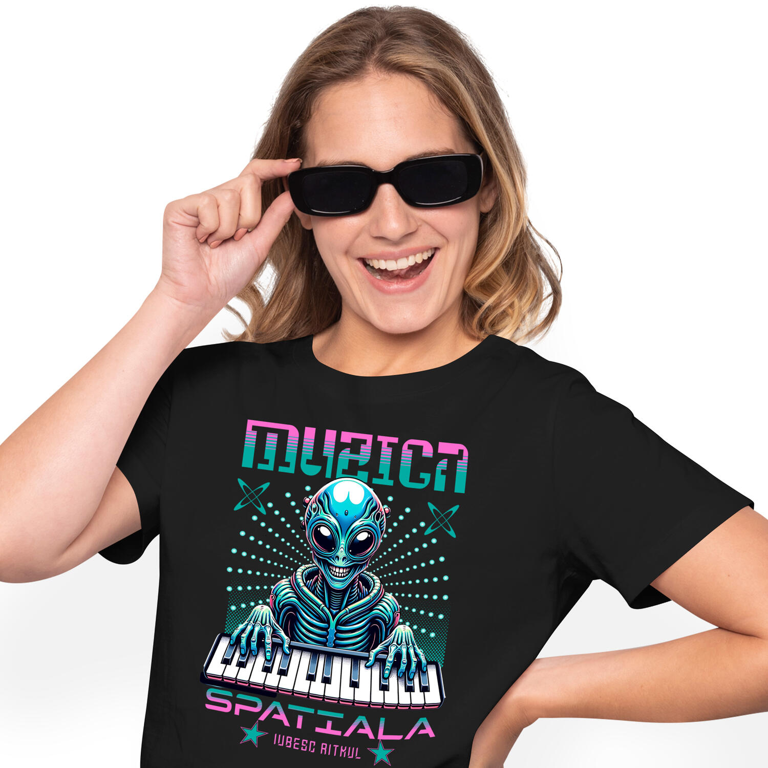 Tricou Femei cu Extraterestru Vesel In Costum Spatial DJ Hobby Meserie Muzica Distractie Petrecere cu imprimeu pe Fata, 100% Bumbac, Negru, L