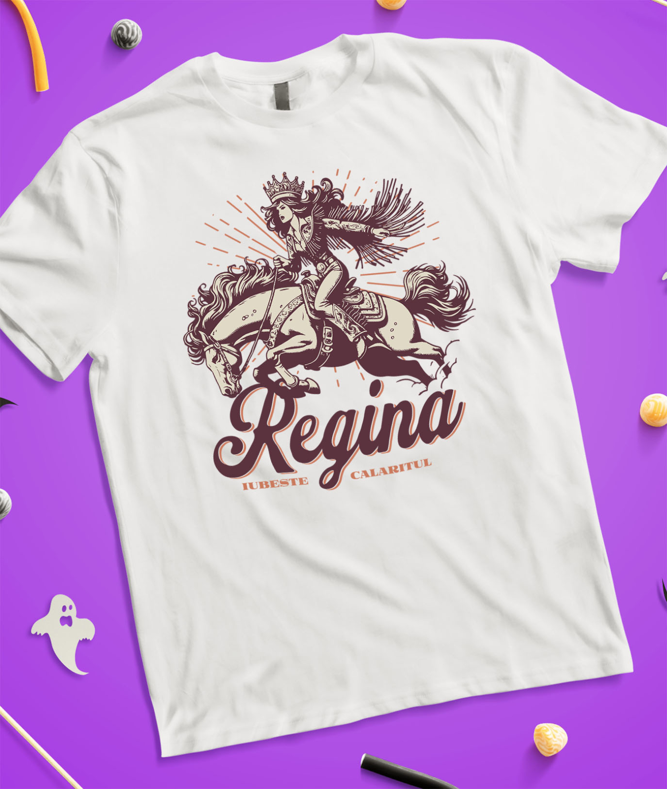 Tricou Femei cu Femeie Cu Coroana Regala Pe Cal Cowgirl cu imprimeu pe Fata, 100% Bumbac, Alb, M