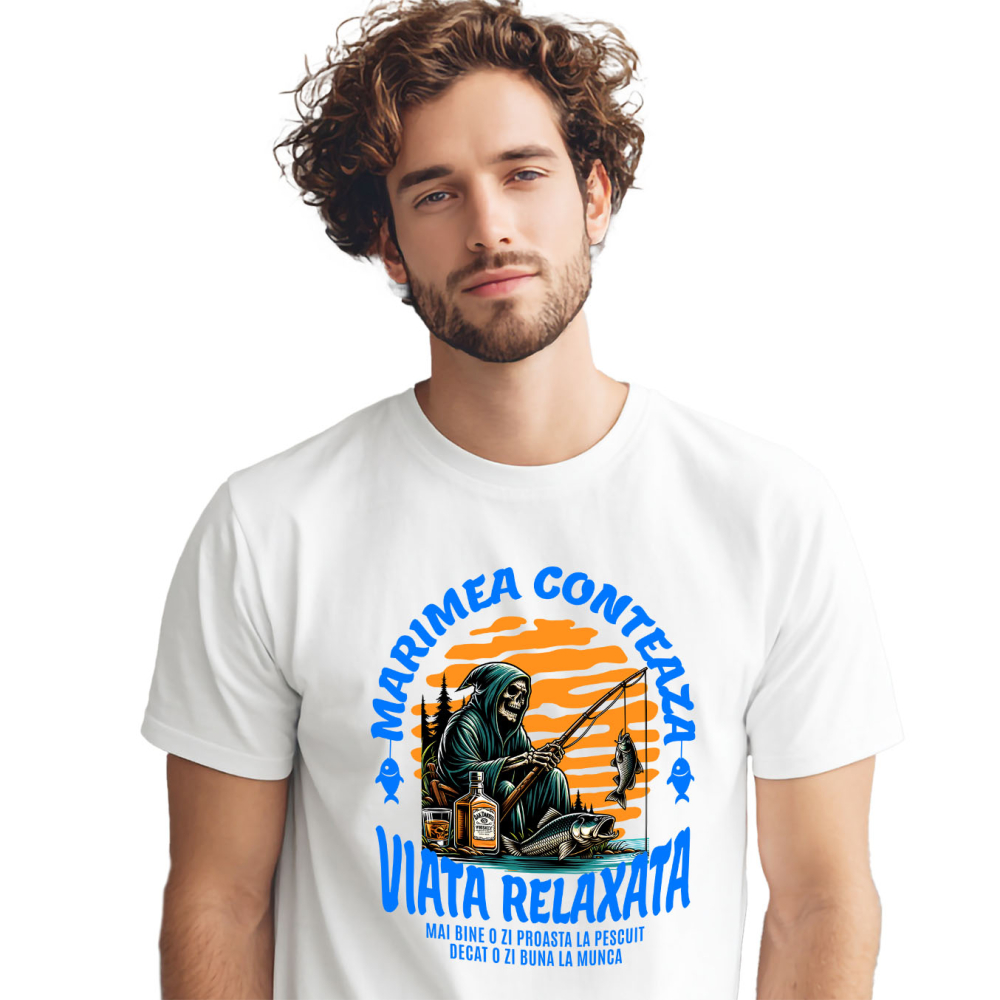 Tricou Barbati cu Moarte Vesela Cu Undita Si Captura Sticla Alcool whiskey Pescuit Hobby cu imprimeu pe Fata, 100% Bumbac, Alb, L