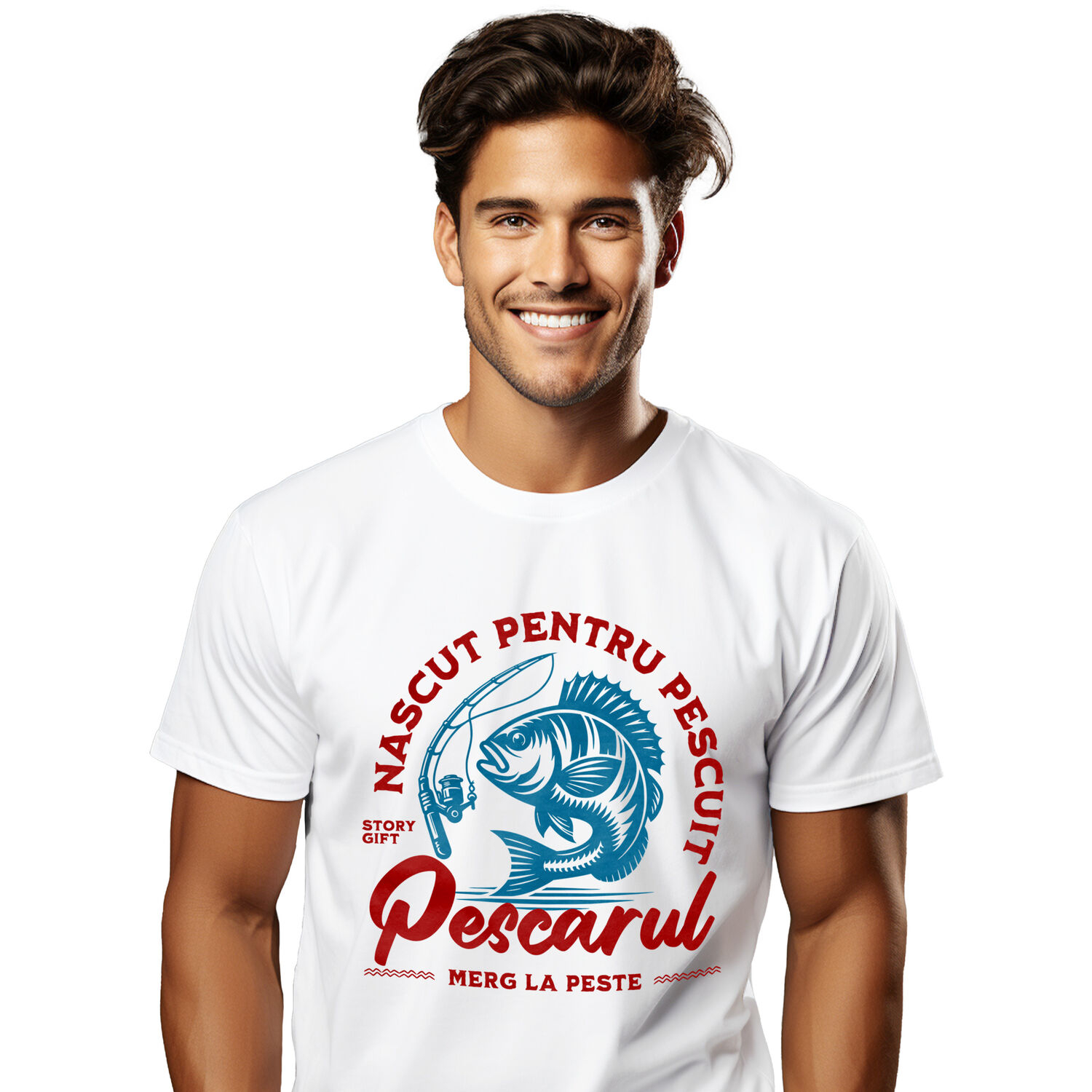 Tricou Barbati cu Peste Cu Undita Balta Iubitorii De Pescuit Natura Relaxare hobby cu imprimeu pe Fata, 100% Bumbac, Alb, S