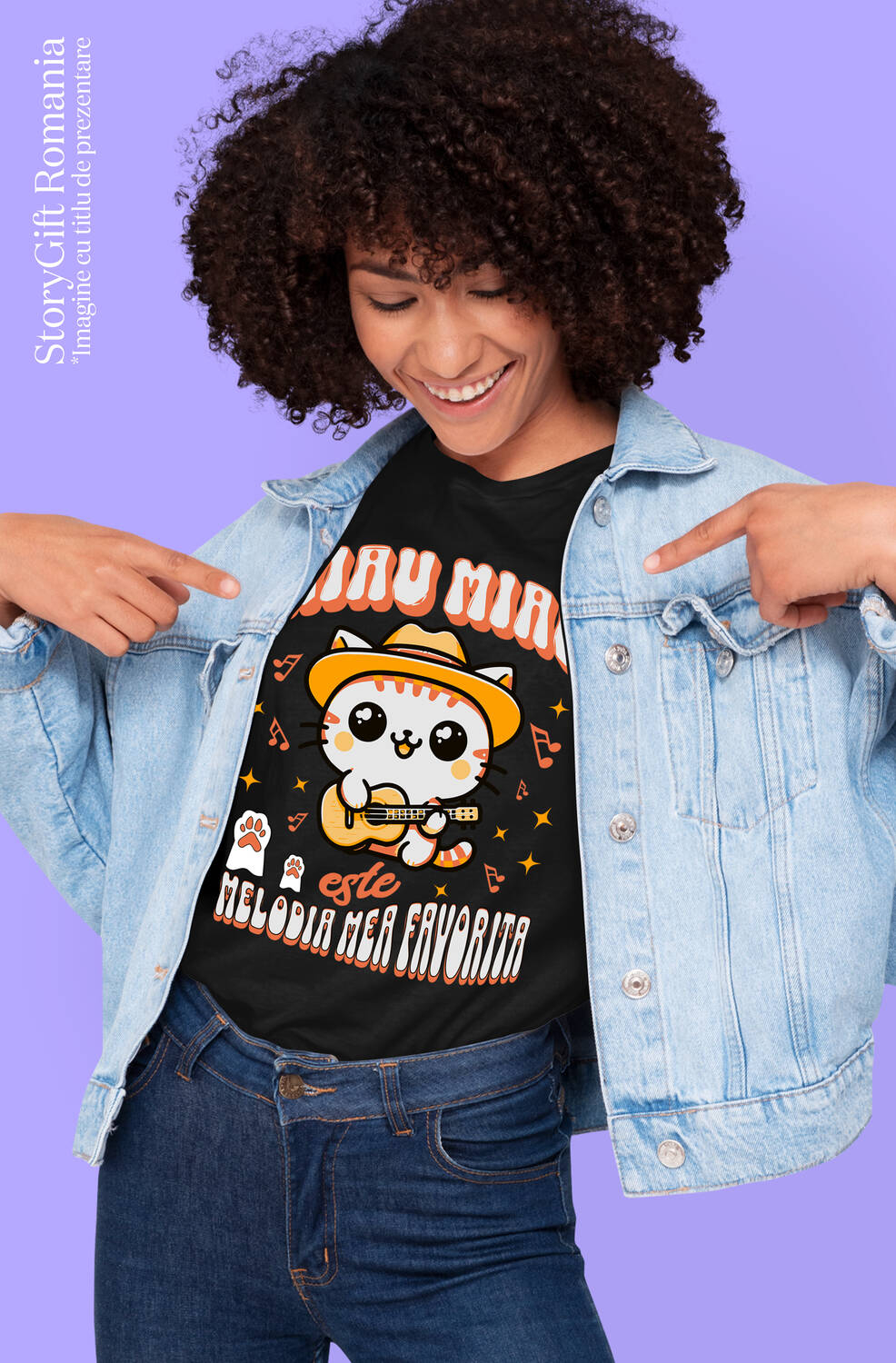 Tricou Femei cu Pisica Cu Palarie Mexicana Si Chitara Muzica Copii Desene Animate cu imprimeu pe Fata, 100% Bumbac, Negru, M