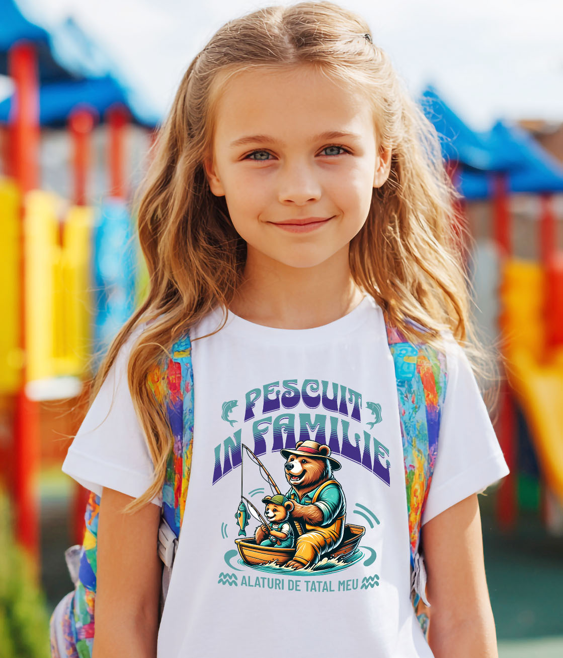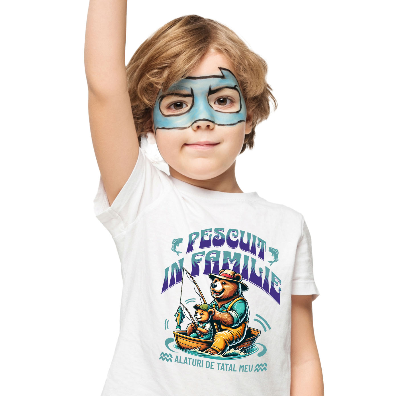 Tricou Copii cu Urs Batran Si Pui Imbracaminte Colorata In Barca Cu Undita De Pescuit Hobby Familie cu imprimeu pe Fata, 100% Bumbac, Alb, 12 Ani