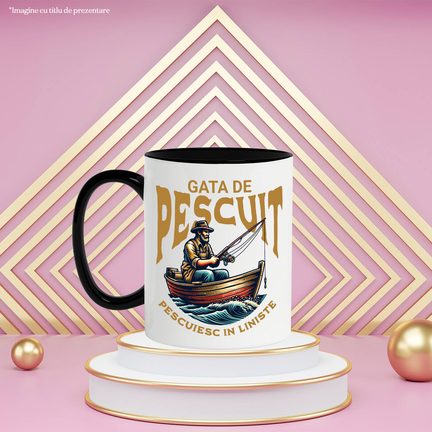Cana Personalizata cu Barbat In Barca De Lemn Undita Text In Limba Romana Liniste Hobby, Ceramica, 330ML, cu Maner Negru