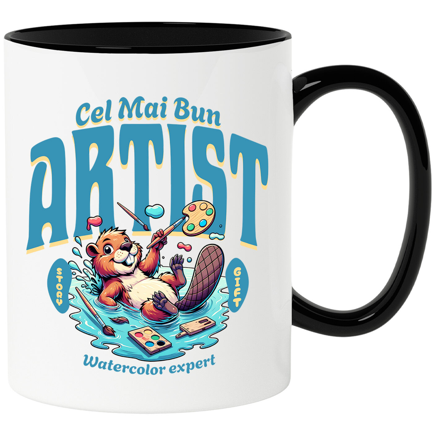 Cana Personalizata cu Castor Vesel In Mare De Apa Pensule Instrumente Pictura , Ceramica, 330ML, cu Maner Negru