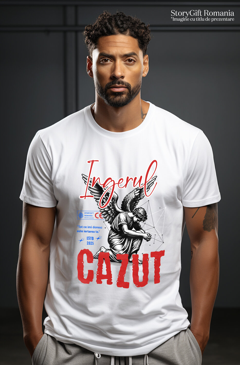 Tricou Barbati cu Barbat In Genunchi Cu Aripi Inger Cazut Arta Abstracta Motivational cu imprimeu pe Fata, 100% Bumbac, Alb, L