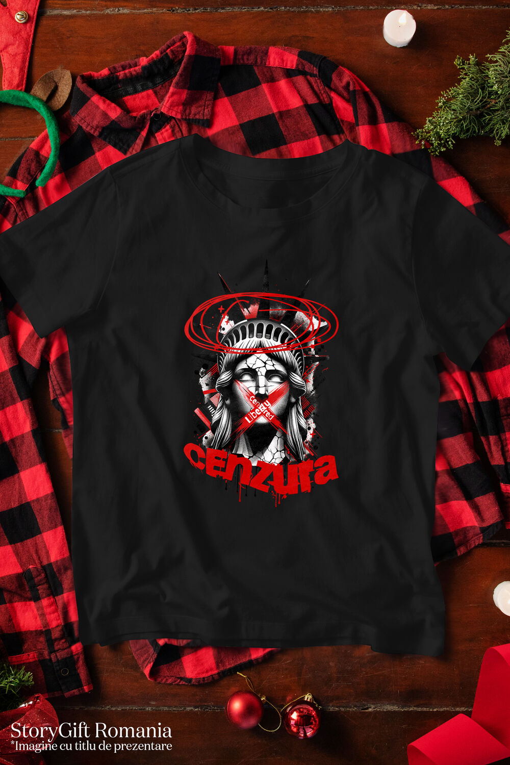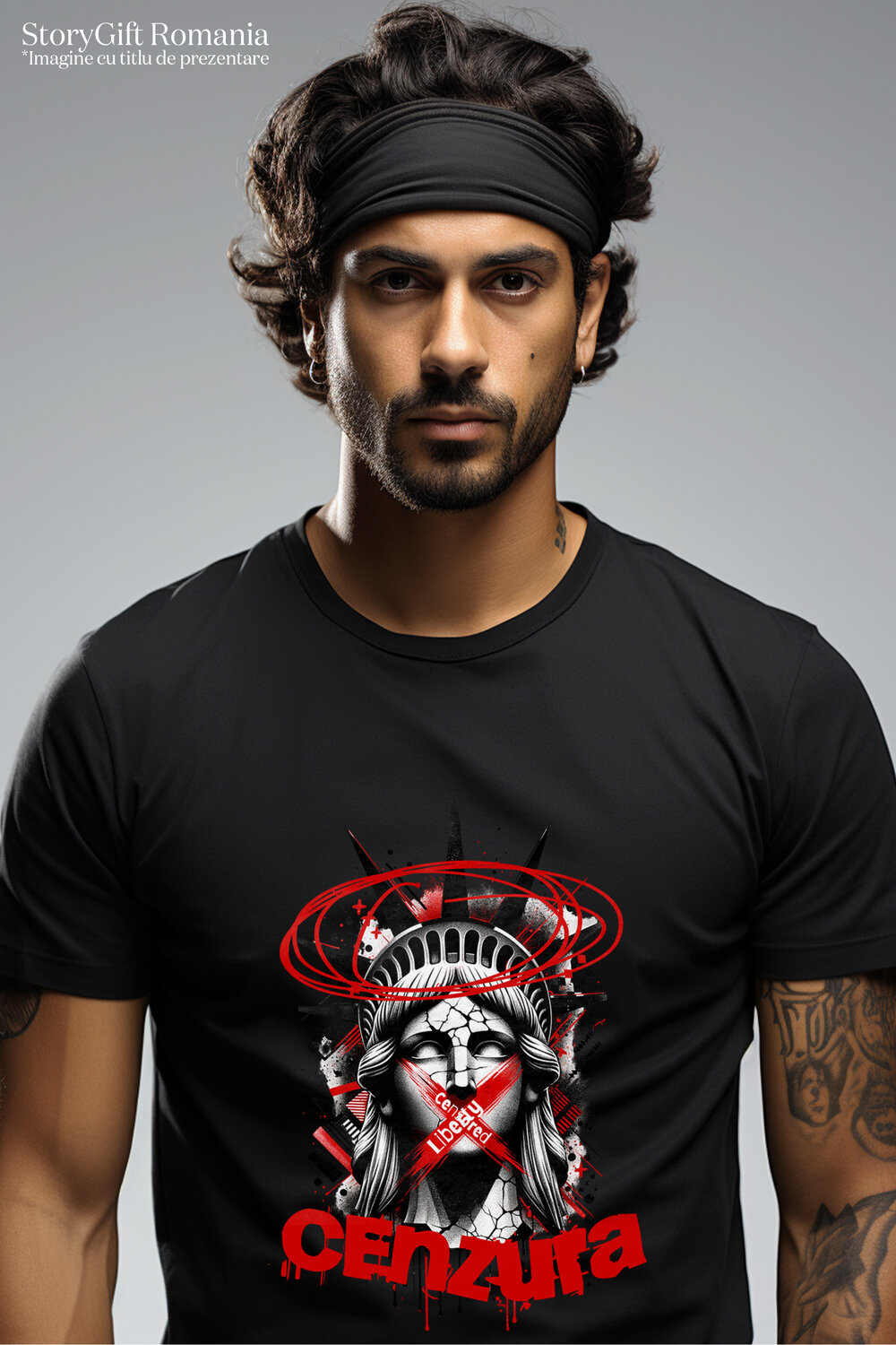 Tricou Barbati cu Chip Statuia Libertatii Cenzura New York Arta Moderna cu imprimeu pe Fata, 100% Bumbac, Negru, L