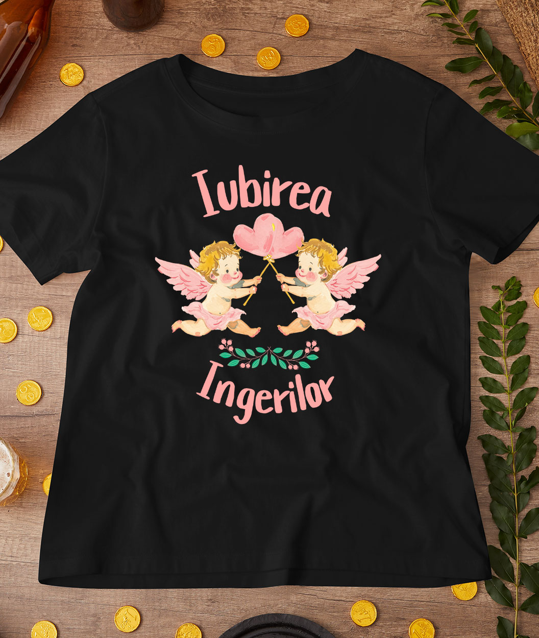 Tricou Femei cu Copii Cu Aripi Zburatori Baloane inimioare Iubirea Ingerilor cu imprimeu pe Fata, 100% Bumbac, Negru, XL