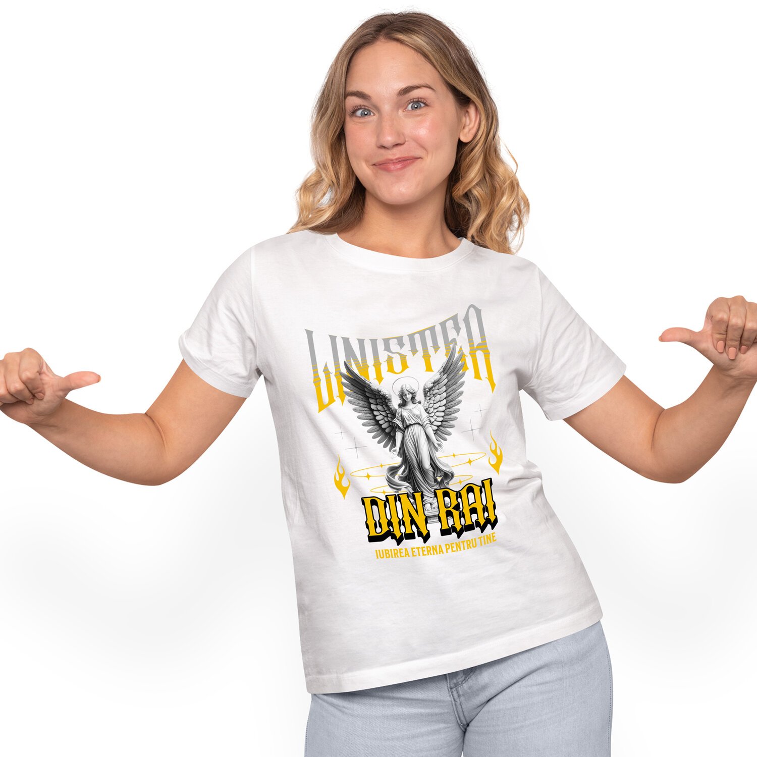 Tricou Femei cu Femeie Statuie Cu Coroana De Inger Si Aura, Arta Abstracta cu imprimeu pe Fata, 100% Bumbac, Alb, S