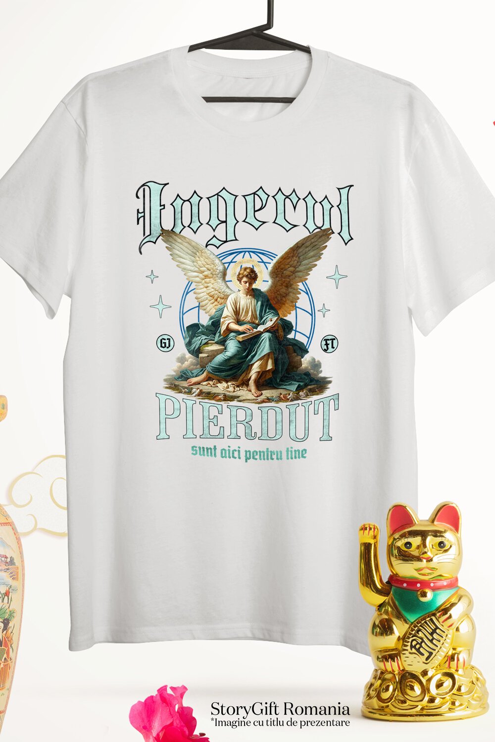 Tricou Barbati cu Inger Stil Ortodox Religios Cu Aura Si aripi Albe, Motivational cu imprimeu pe Fata, 100% Bumbac, Alb, S