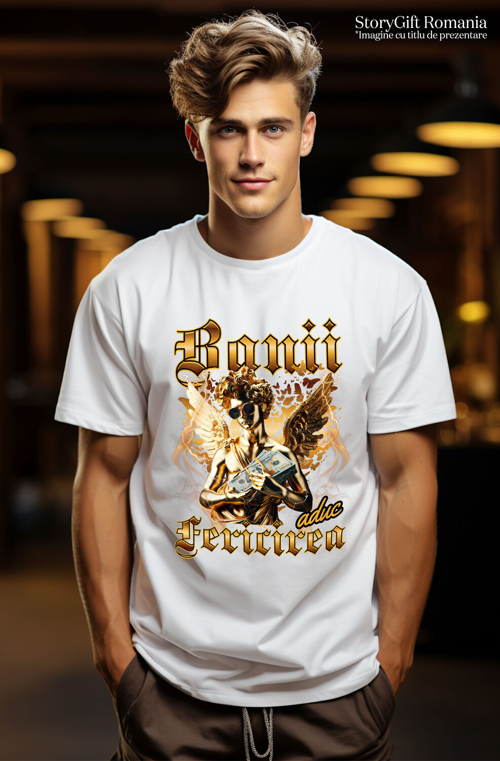Tricou Barbati cu Statuie De Aur Cu Aripi Si Ochelari De Soare, Teanc De Bani cu imprimeu pe Fata, 100% Bumbac, Alb, S