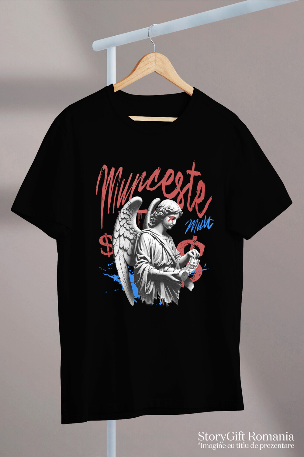 Tricou Barbati cu Statuie Fata Cu aripi De Inger Rola De Bancnote bani, Avere, Motivational cu imprimeu pe Fata, 100% Bumbac, Negru, L