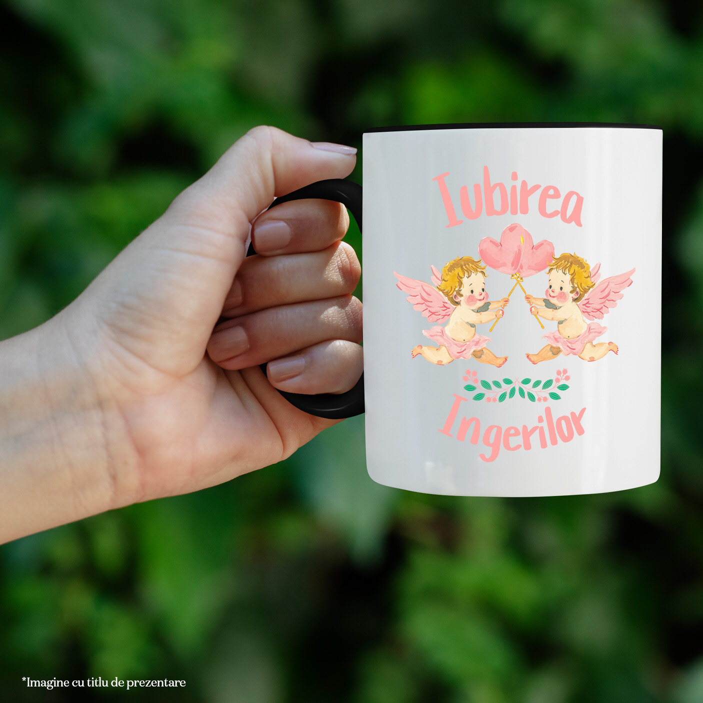 Cana Personalizata cu Copii Cu Aripi Zburatori Baloane inimioare Iubirea Ingerilor, Ceramica, 330ML, cu Maner Negru