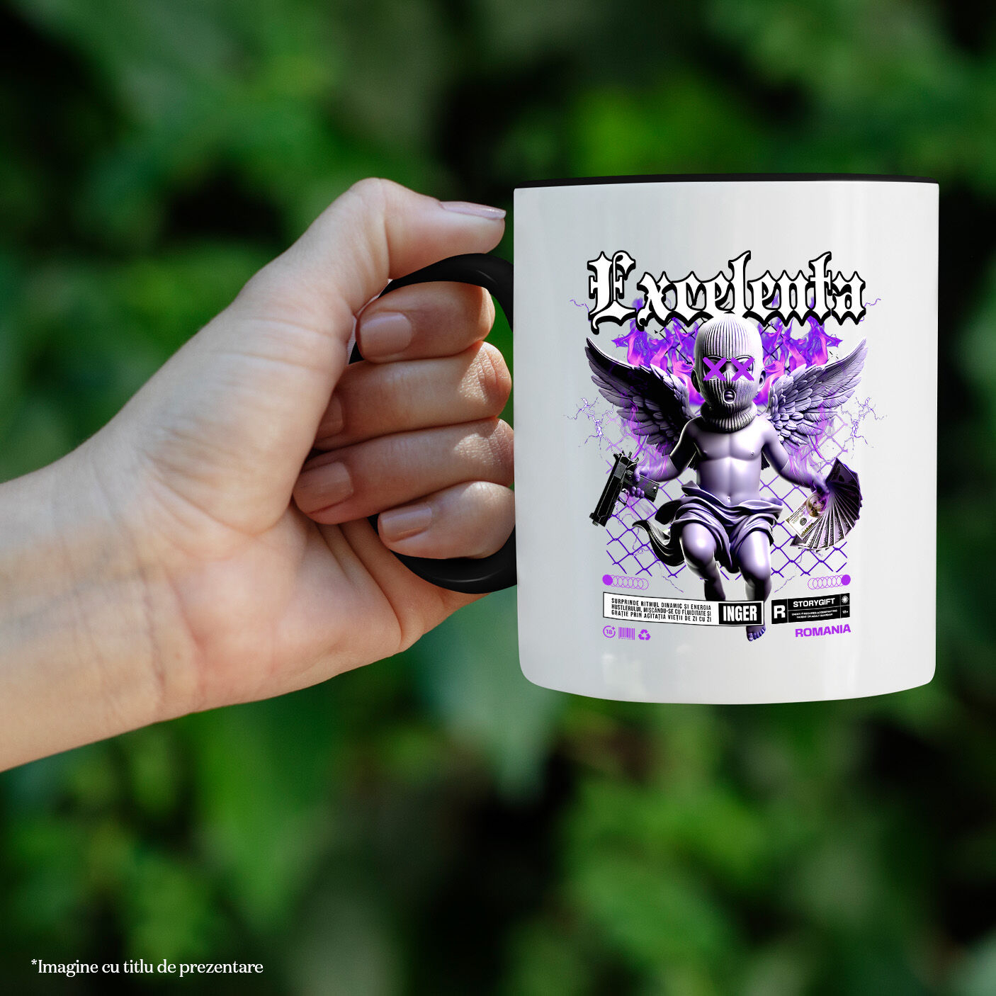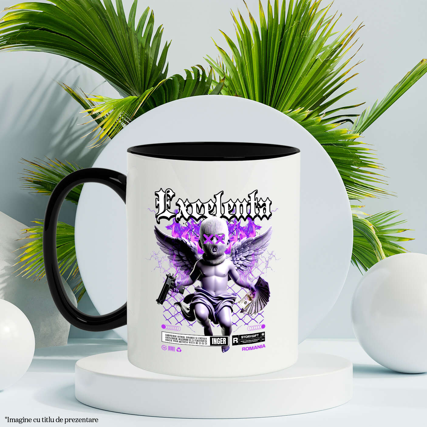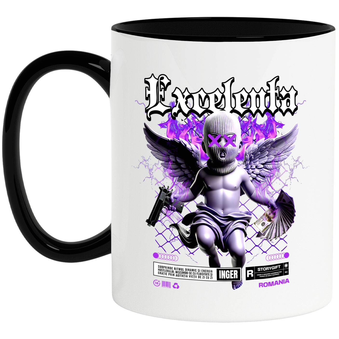 Cana Personalizata cu Copil Cu Aripi Cagula Pe Cap, Arma Bani Bancnote, Motivational, Ceramica, 330ML, cu Maner Negru