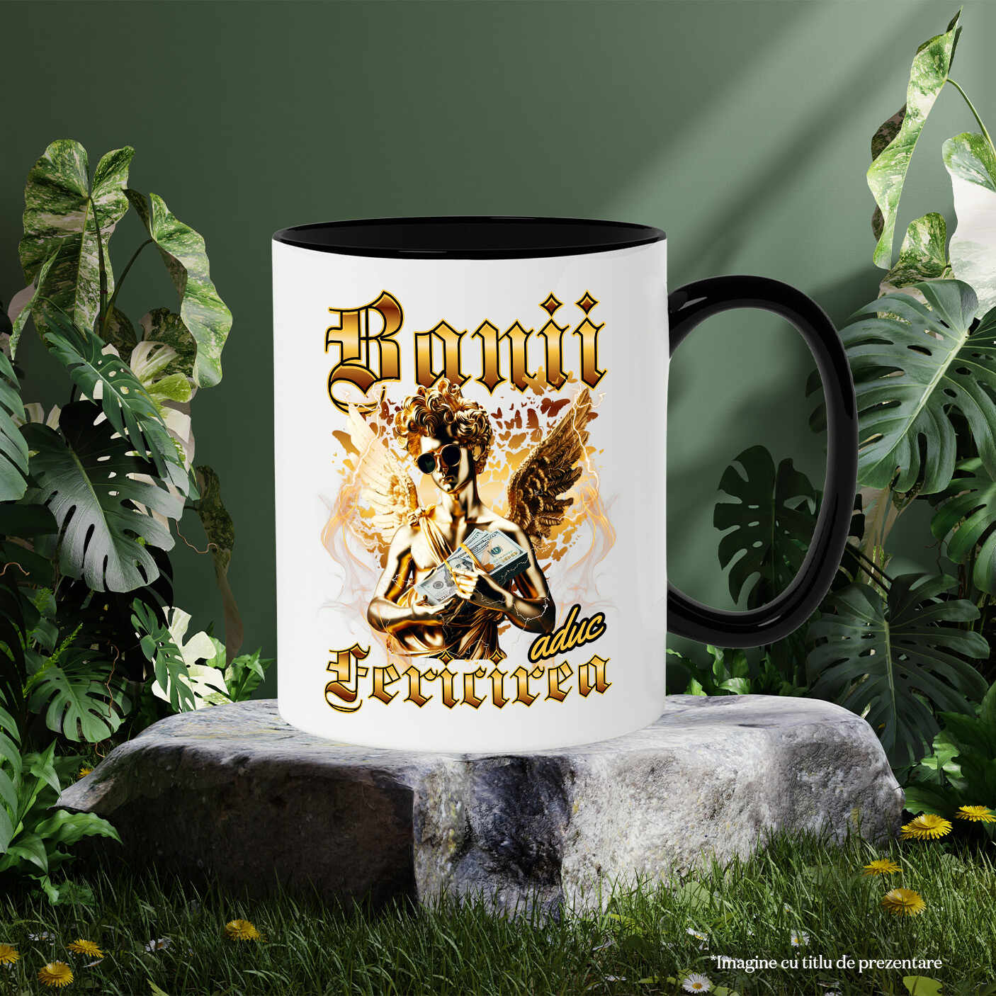 Cana Personalizata cu Statuie De Aur Cu Aripi Si Ochelari De Soare, Teanc De Bani, Ceramica, 330ML, cu Maner Negru