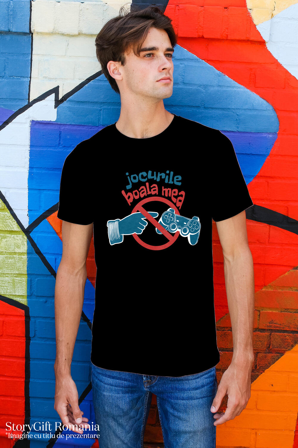 Tricou Barbati cu Semn Interzis Mana Umana, Maneta Jocuri Video, Lume Digitala cu imprimeu pe Fata, 100% Bumbac, Negru, L
