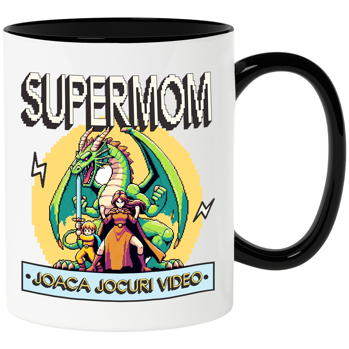 Cana Personalizata cu Dragon Jocuri Video Cu Luptatoare razboinica SuperMom, Ceramica, 330ML, cu Maner Negru