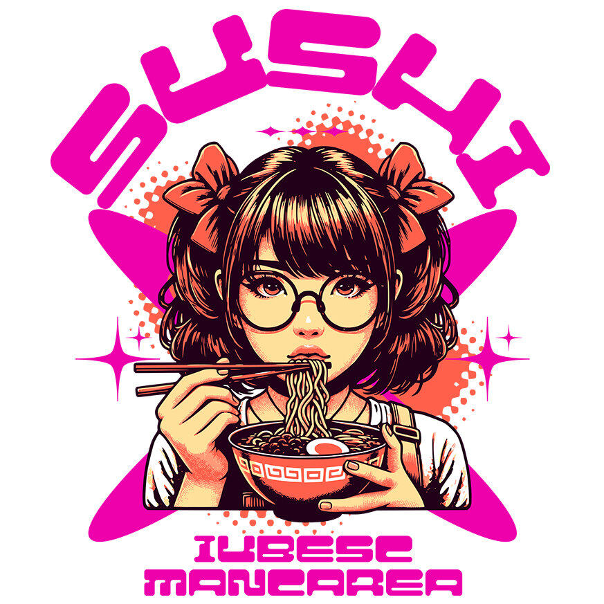 Sticker Personalizat cu Fata Stil Anime Cu Fundite Si Ochelari De Vedere Mancand Supa Noodles Sushi cu Margini Albe, PVC Vinyl 10 cm