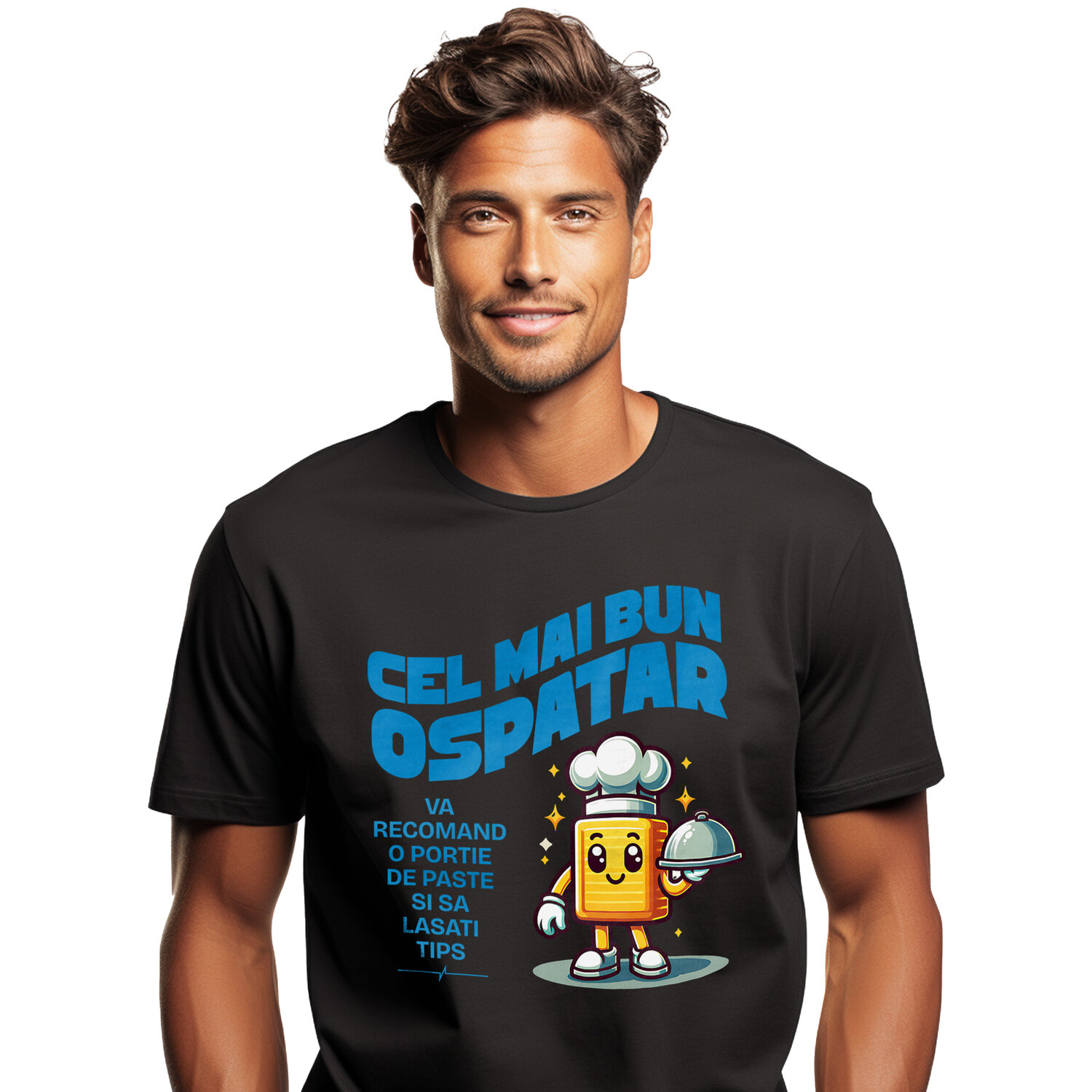 Tricou Barbati cu Bucata De Unt Cu Palarie De Cheff Platou Ospatar Meserie cu imprimeu pe Fata, 100% Bumbac, Negru, L