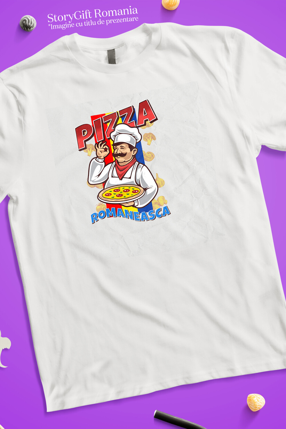 Tricou Barbati cu Bucatar Cheff Gras Cu Mustata Si Palarie Rosie Steagul Romaniei Pizza Romaneasca cu imprimeu pe Fata, 100% Bumbac, Alb, L