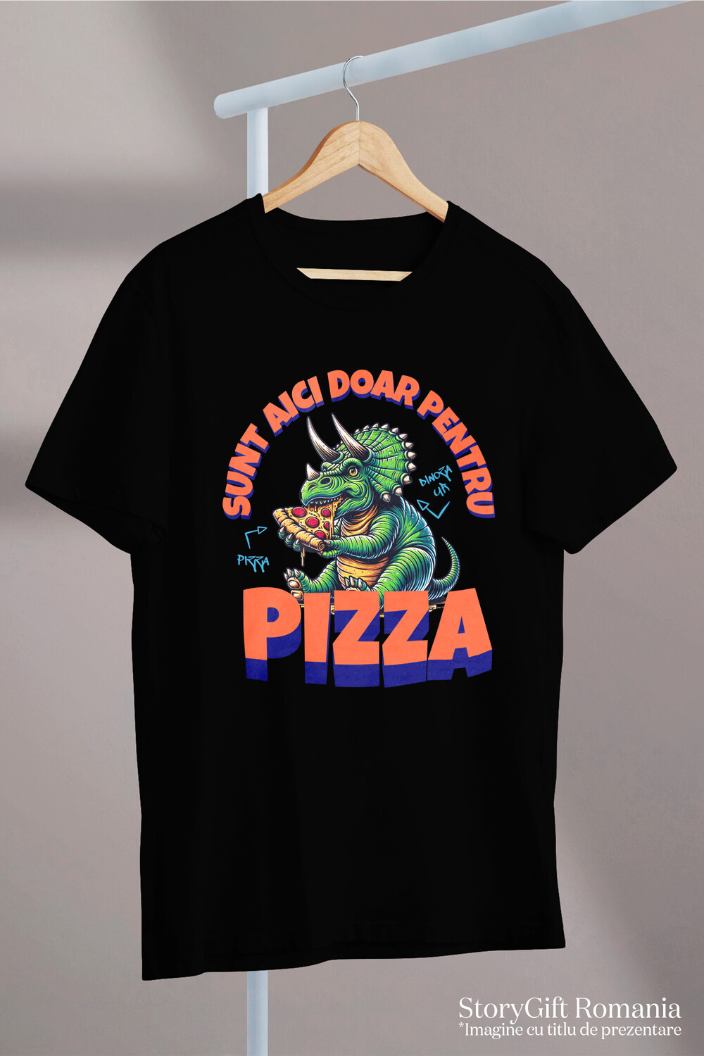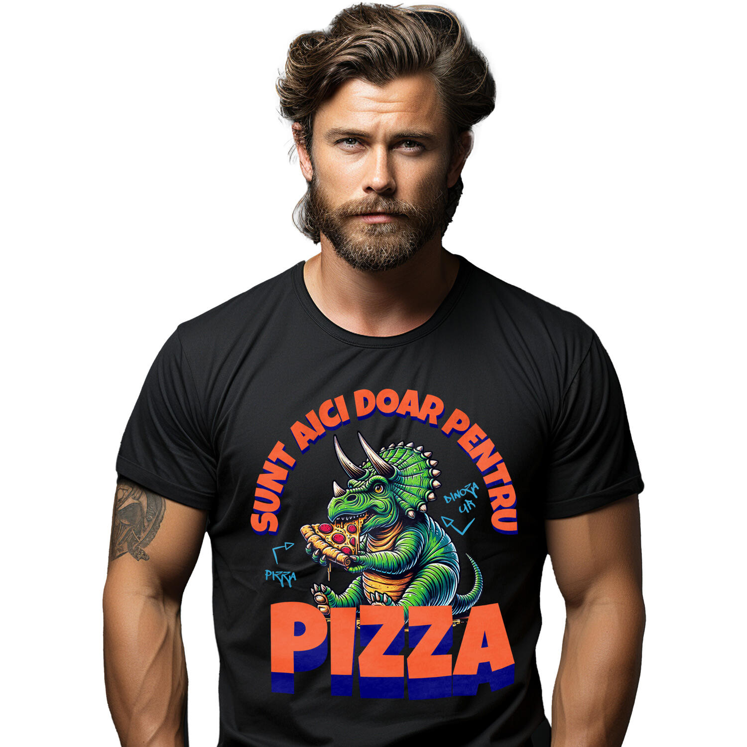 Tricou Barbati cu Dinozaur Verde Batran Cu Coarne Iubitor De Pizza Animal cu imprimeu pe Fata, 100% Bumbac, Negru, L
