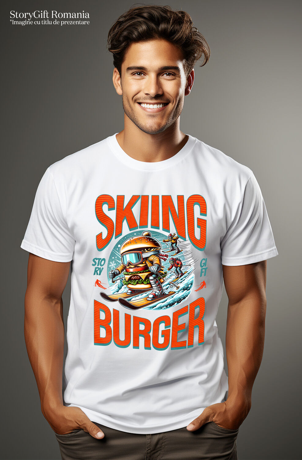 Tricou Barbati cu Dublu Burger imens Schiuri Pe Partie Cu ochelari De Sport Fast Food cu imprimeu pe Fata, 100% Bumbac, Alb, M