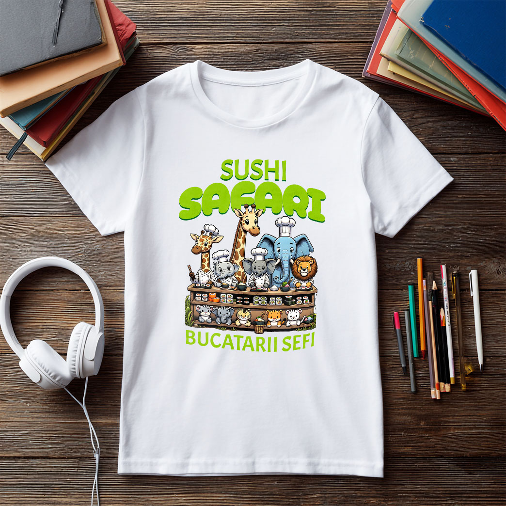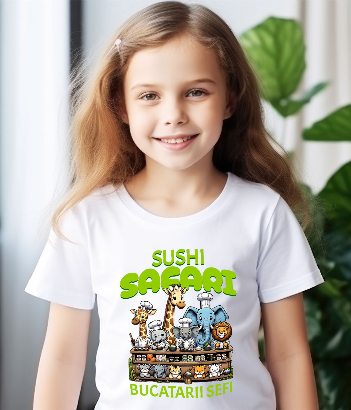 Tricou Copii cu Echipa Bucatarii Cheff Aniamle Din Jungla Preparat Sushi Cultura Asiatica Copii Desene Animate cu imprimeu pe Fata, 100% Bumbac, Alb, 10 Ani