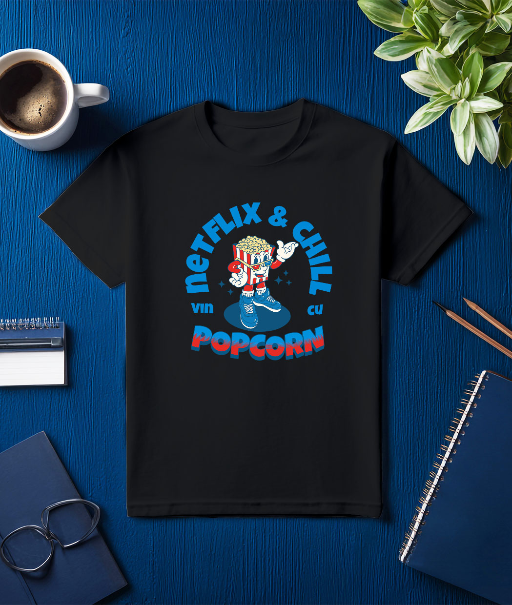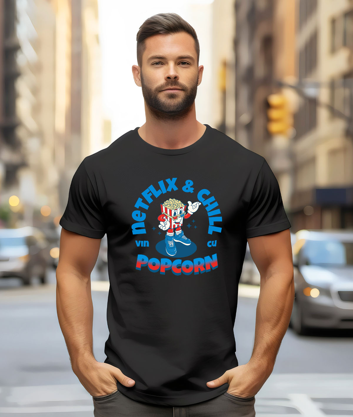 Tricou Barbati cu Punga Popcorn Cu Ochelari 3D Adidasi albastri Film Cinema Netflix & Chill cu imprimeu pe Fata, 100% Bumbac, Negru, L