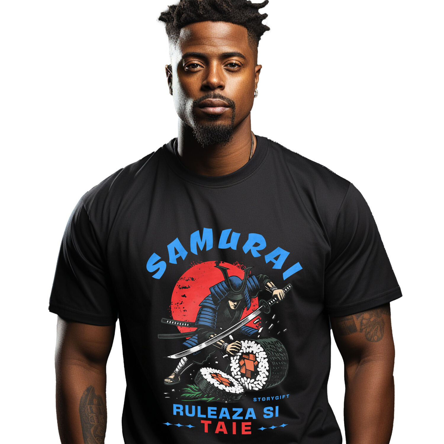 Tricou Barbati cu Samurai Ninja Cu Sabie Ascutita Sushi Mancare Chinezeasca Pofticios cu imprimeu pe Fata, 100% Bumbac, Negru, L