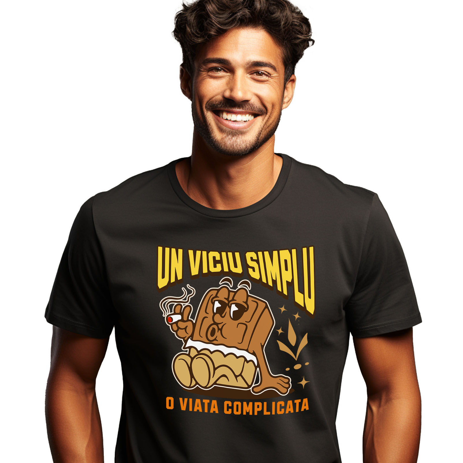 Tricou Barbati cu Tableta De Ciocolata Relaxare Fumand Iubitorii De Ciocolata Si Tigari cu imprimeu pe Fata, 100% Bumbac, Negru, L