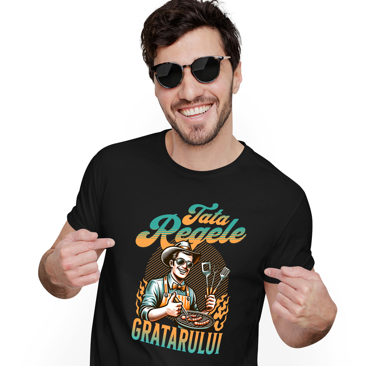 Tricou Barbati cu Tata Cu Palarie De Soare Si ochelari, Sort Si Papion Portocaliu Gratar Instrumente cu imprimeu pe Fata, 100% Bumbac, Negru, L