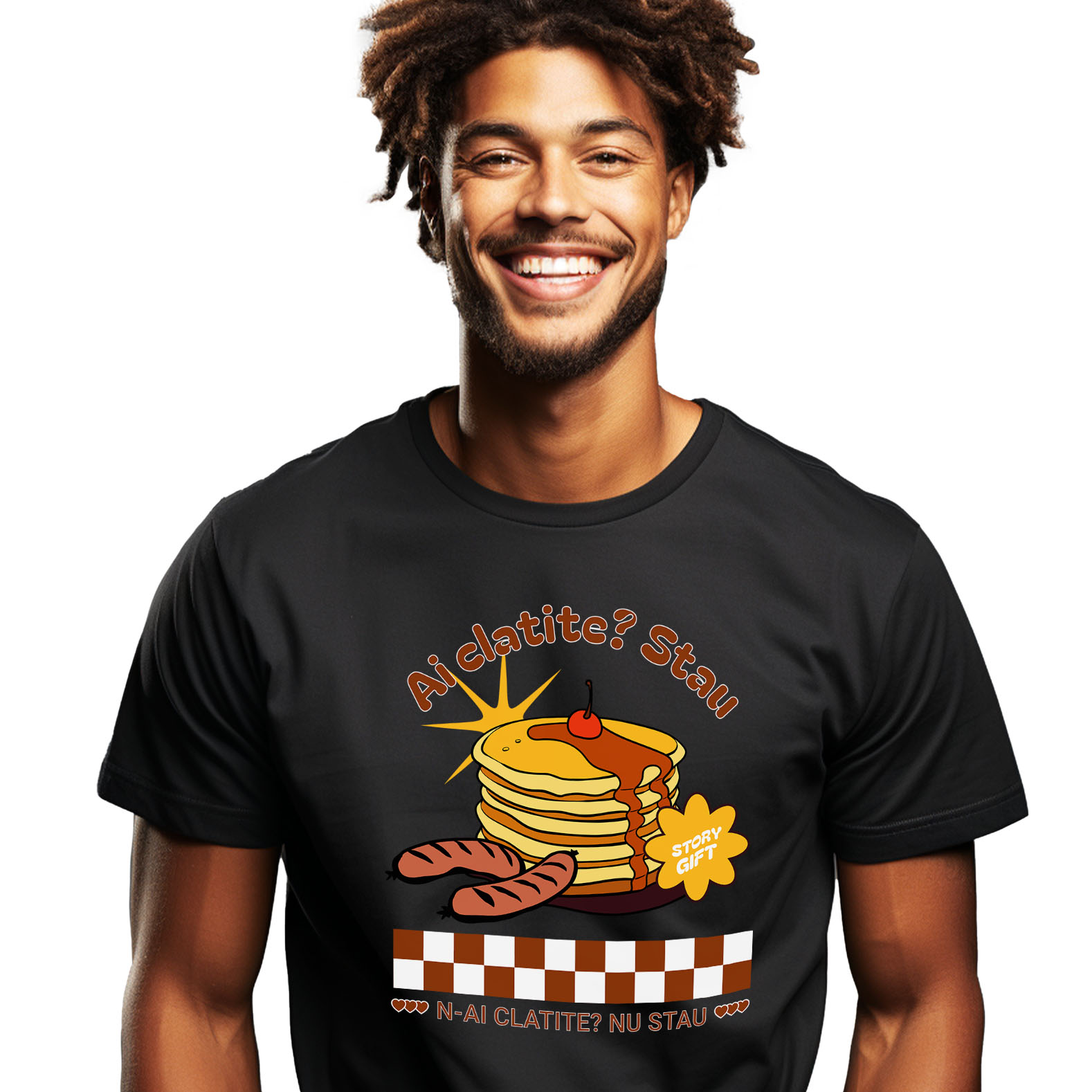 Tricou Barbati cu Turn Clatite Cu Aroma Si Cireasa Dulciuri Copilarie Desert cu imprimeu pe Fata, 100% Bumbac, Negru, L