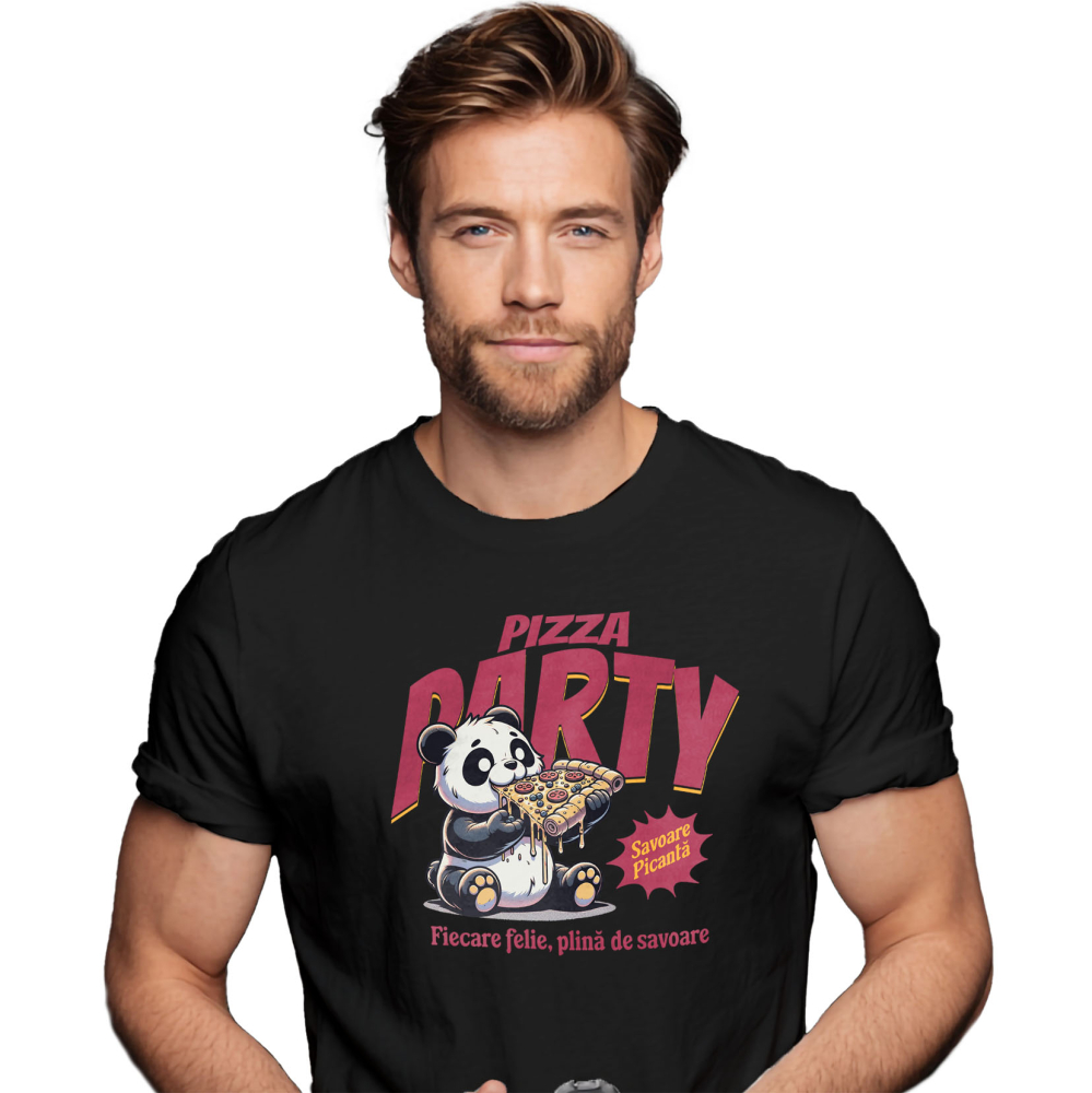 Tricou Barbati cu Urs Panda Gras Cu Felie De Pizza Fast Food mancare cu imprimeu pe Fata, 100% Bumbac, Negru, L